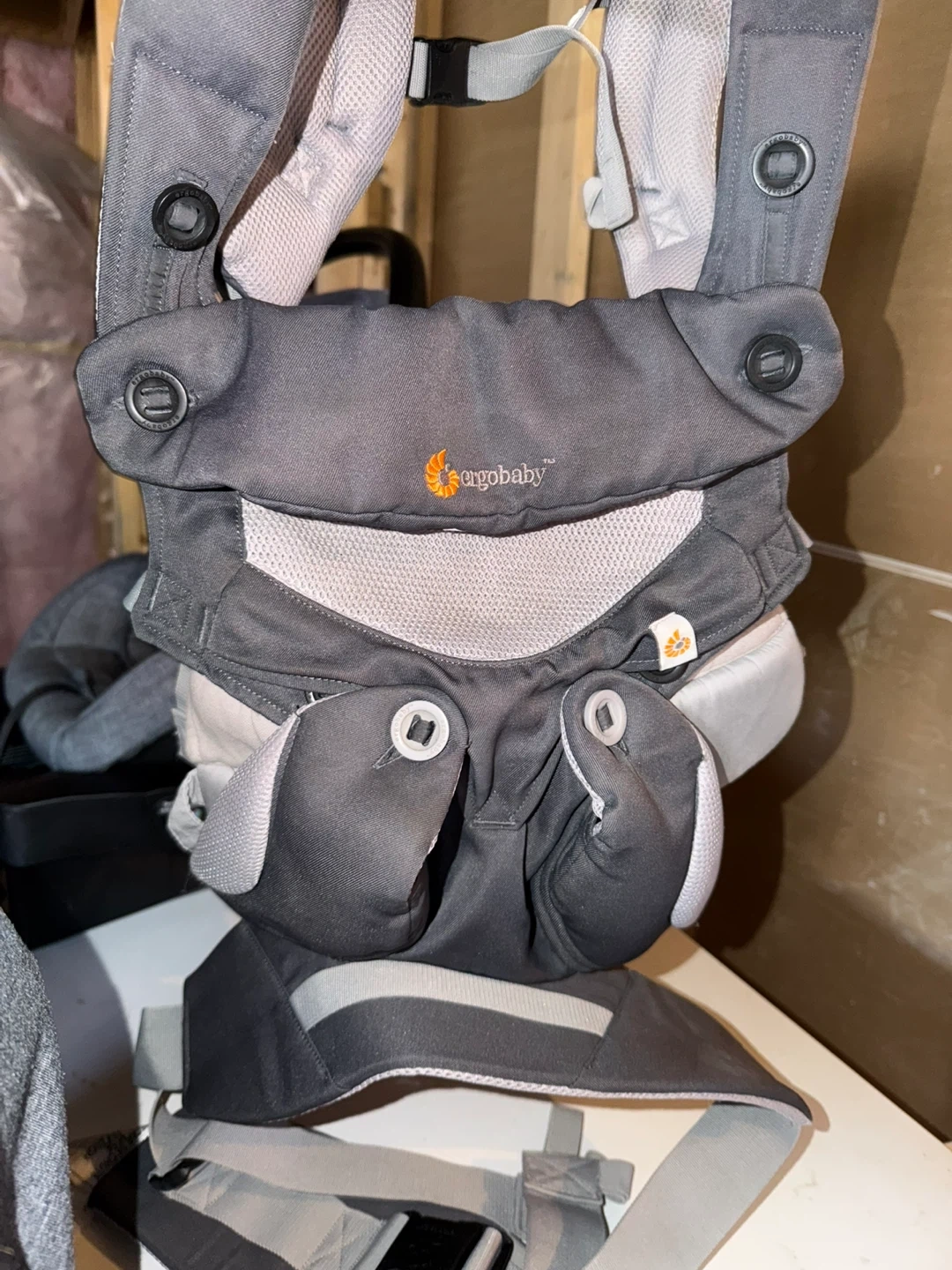 Ergobaby carrier in grey. It's made with durable fabric and features adjustable straps for a comfortable fit. This carrier is designed for multiple carrying positions. Suitable for infants and toddlers.