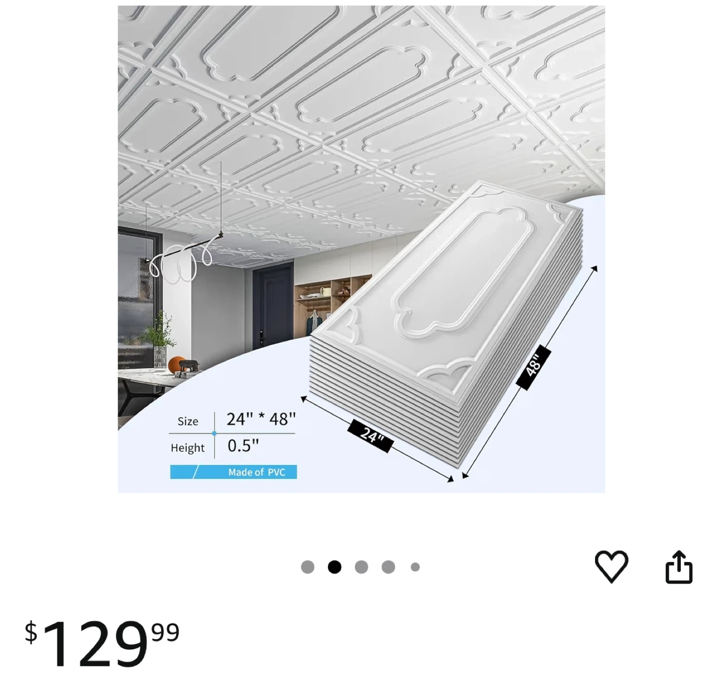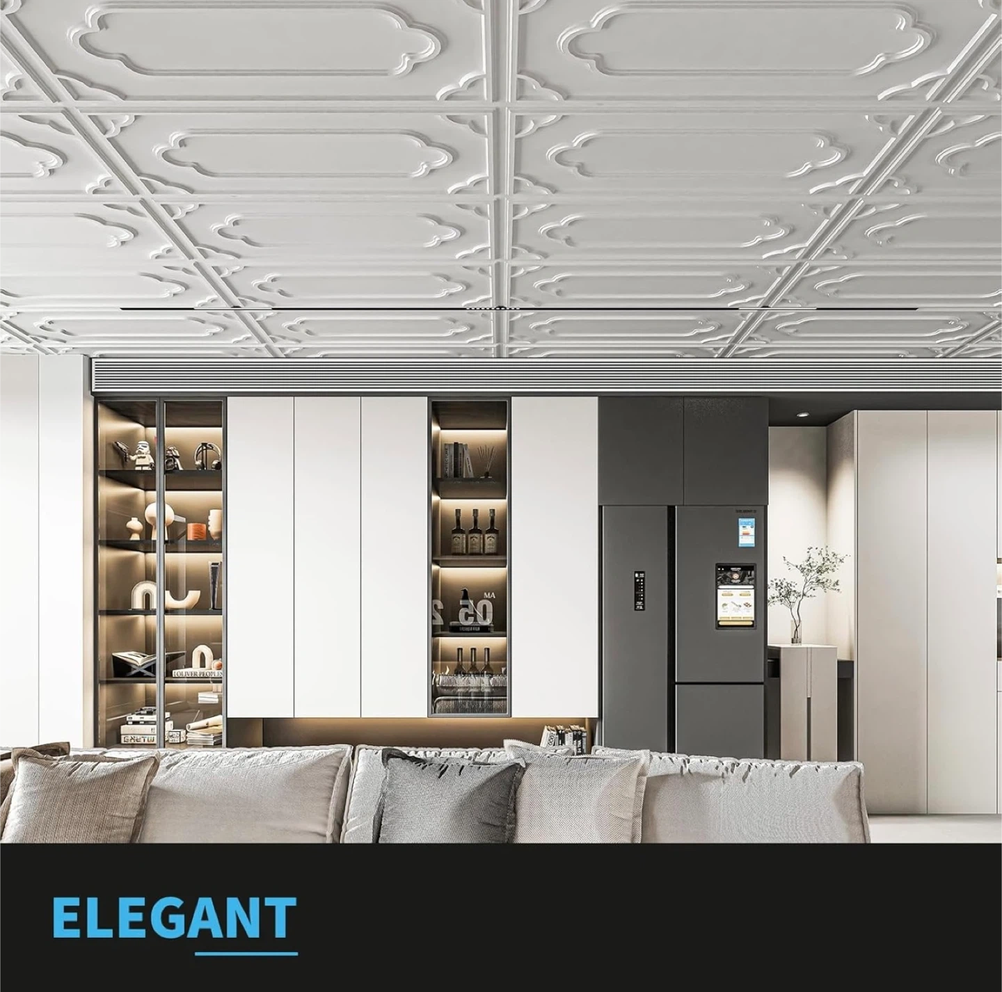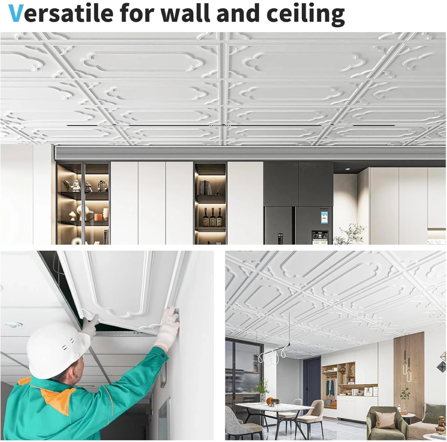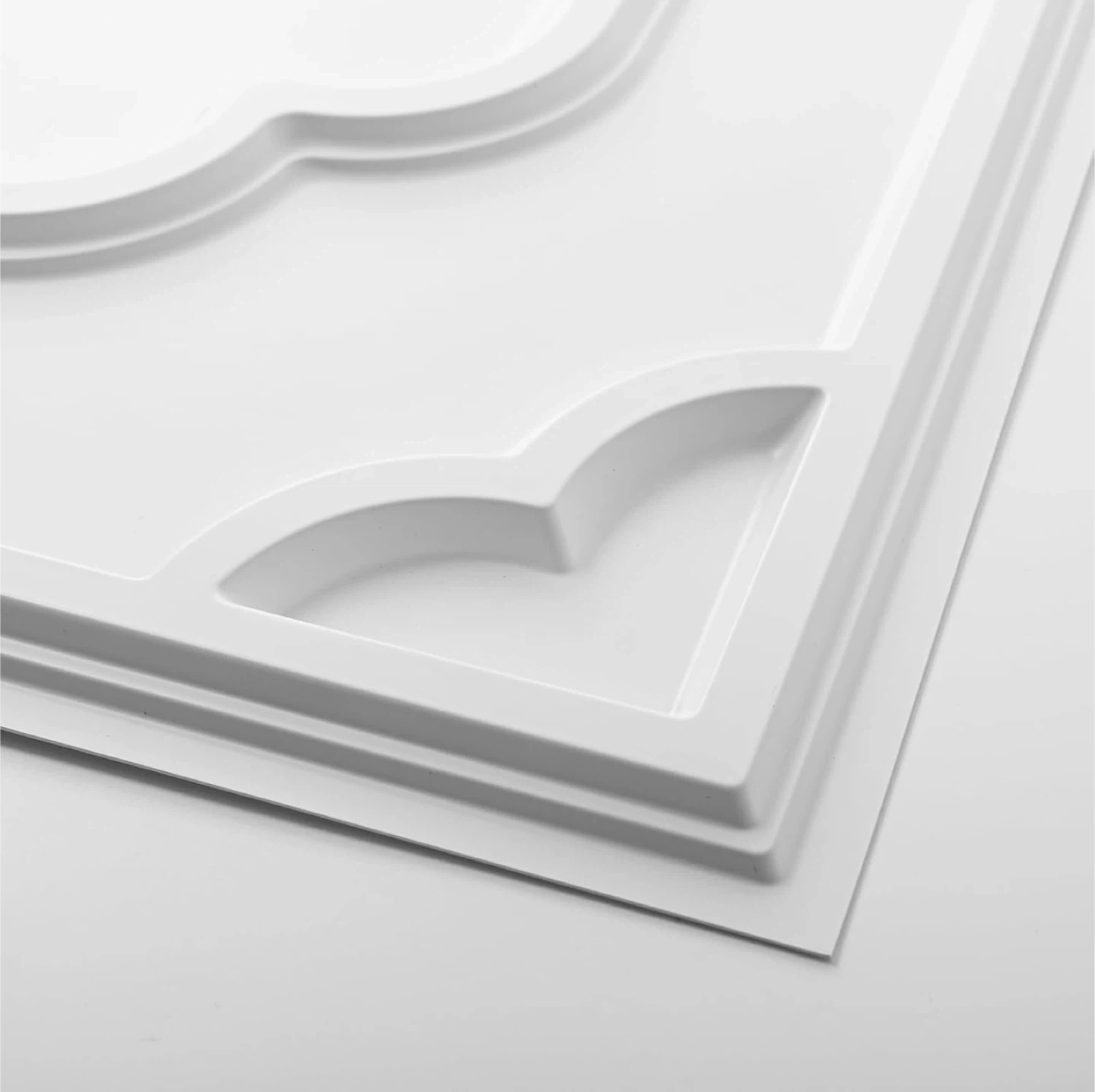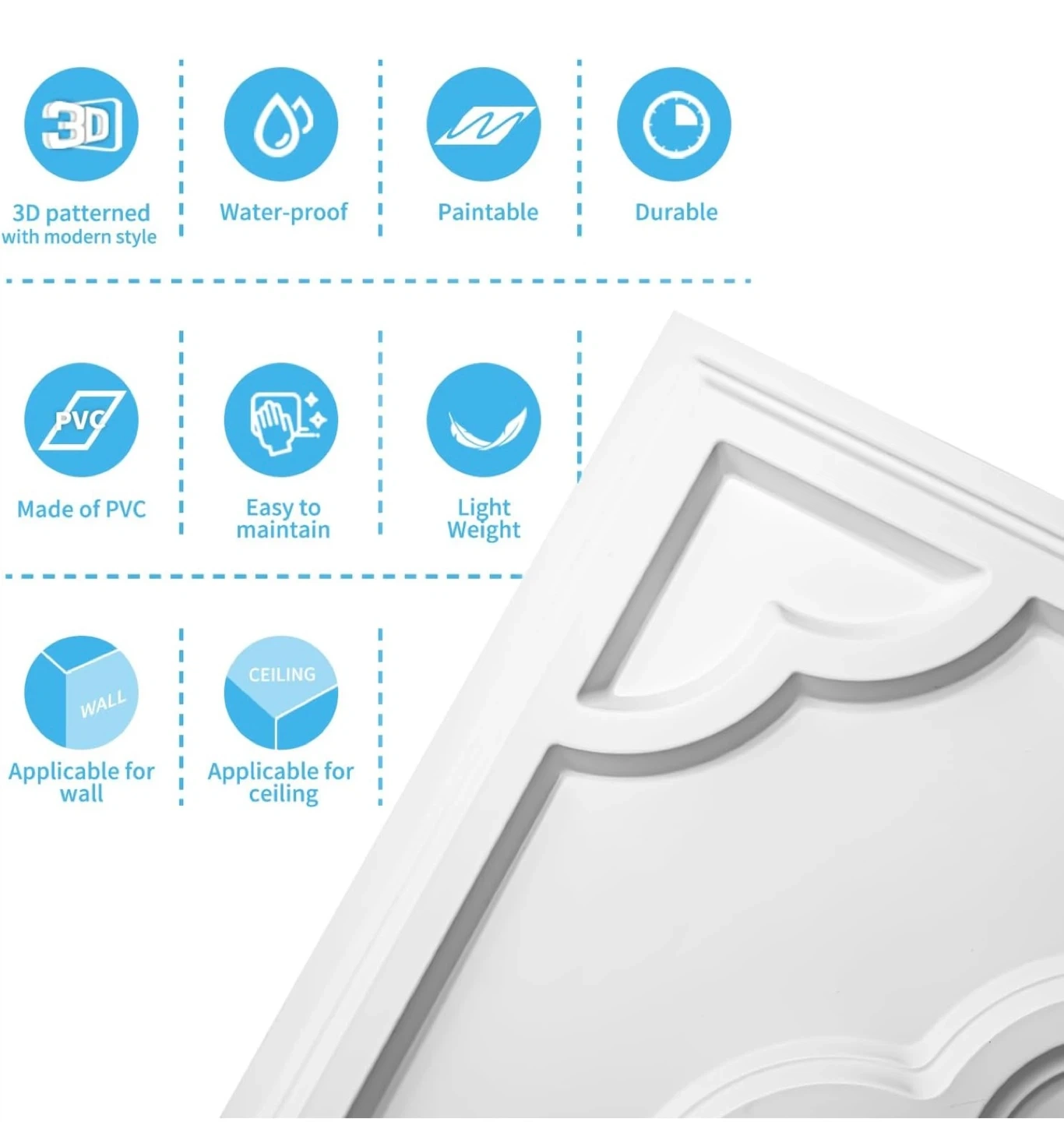 S These white PVC decorative ceiling tiles feature a 3D patterned modern style. They're water-proof, rustless, and durable. Tiles are 24" x 48" with a 0.5" height. They can be used on walls or ceilings!