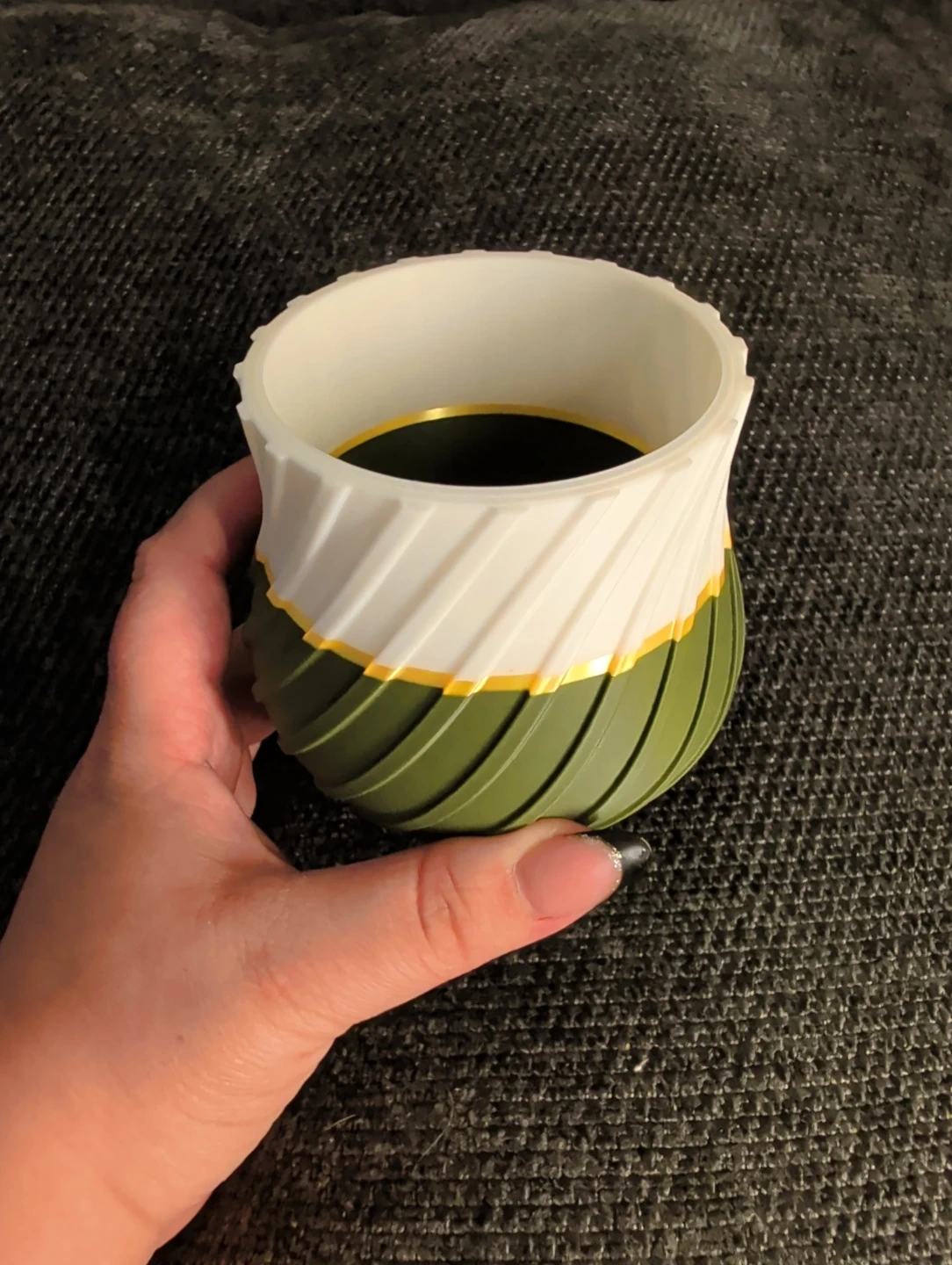 3D printe Twisted Decorative Planter – Olive Green, White & Gold