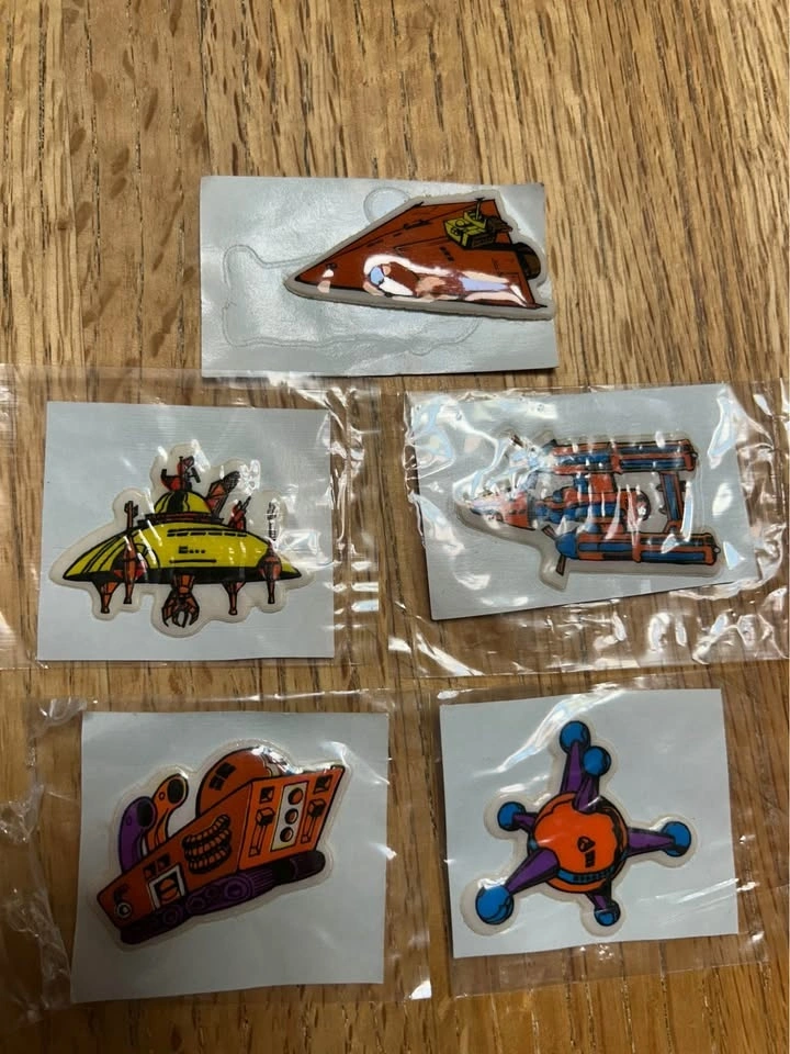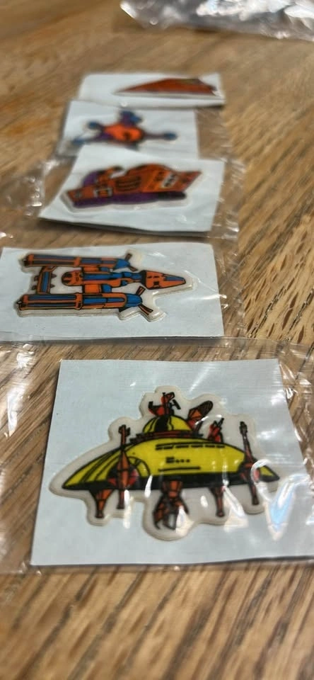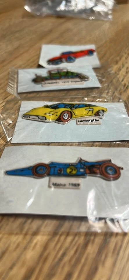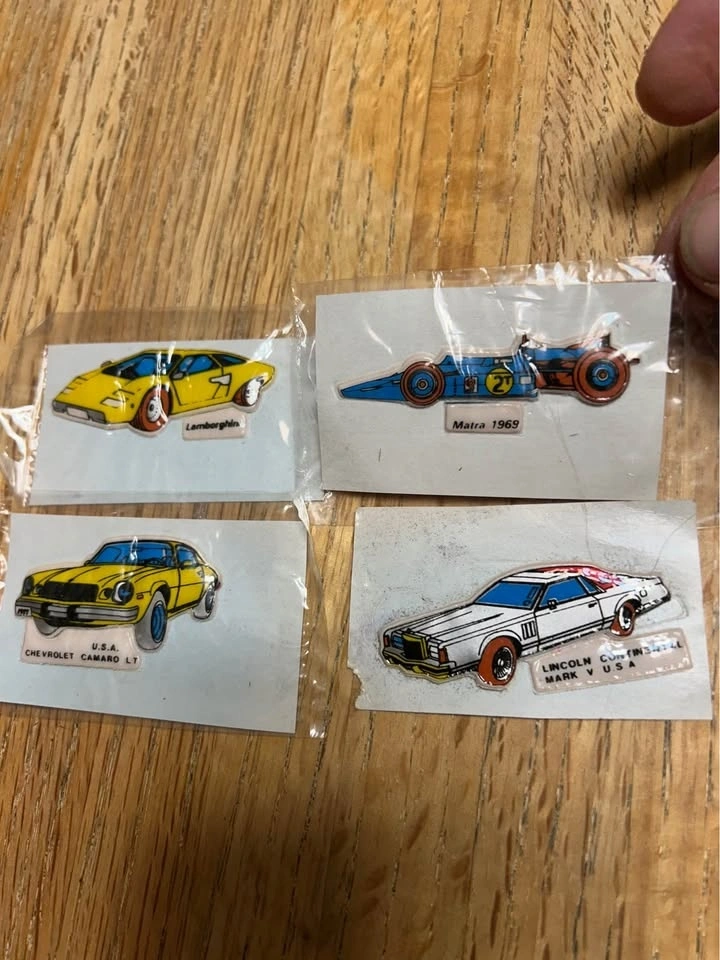 9 are new unopened, 3 are opened. 1977 Chevrolet Camaro LT, Chevrolet Corvette, Lincoln Continental Mark V, Lamborghini Countach, Fiat 124 Sport Spider convertible, 1912 Vermorel, Matra 1969 F1 race car and 5 space sci-fi themed stickers.