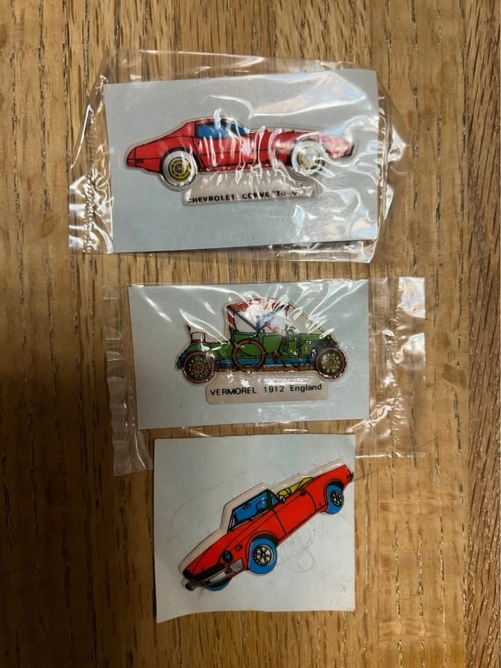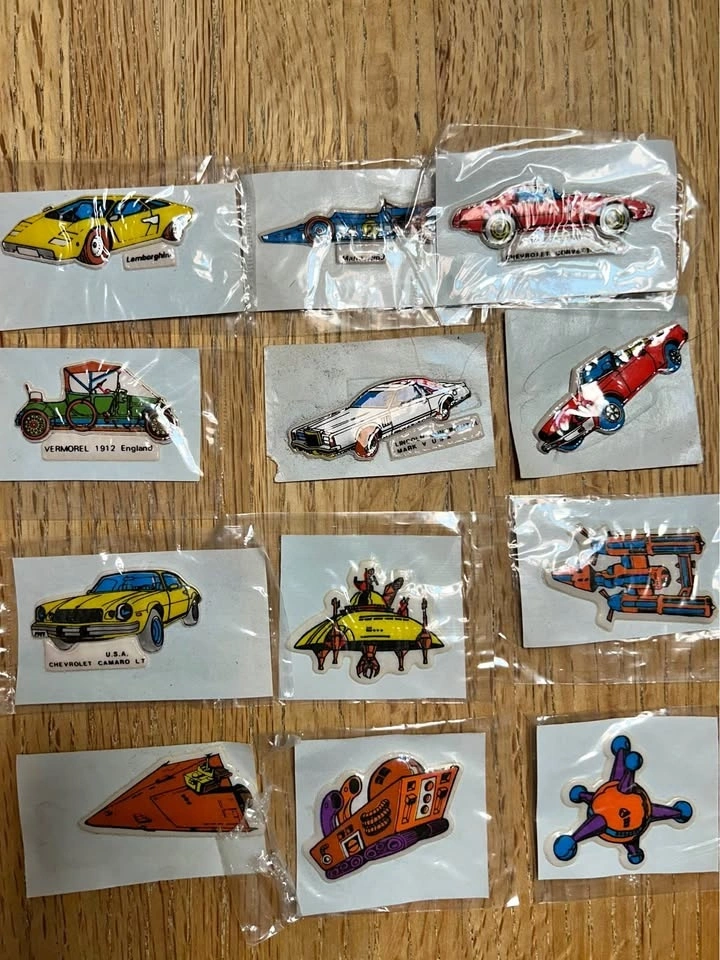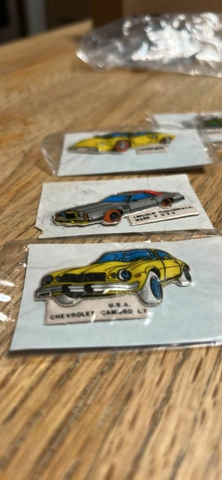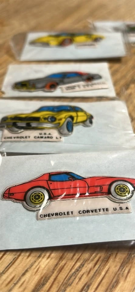 9 are new unopened, 3 are opened. 1977 Chevrolet Camaro LT, Chevrolet Corvette, Lincoln Continental Mark V, Lamborghini Countach, Fiat 124 Sport Spider convertible, 1912 Vermorel, Matra 1969 F1 race car and 5 space sci-fi themed stickers.