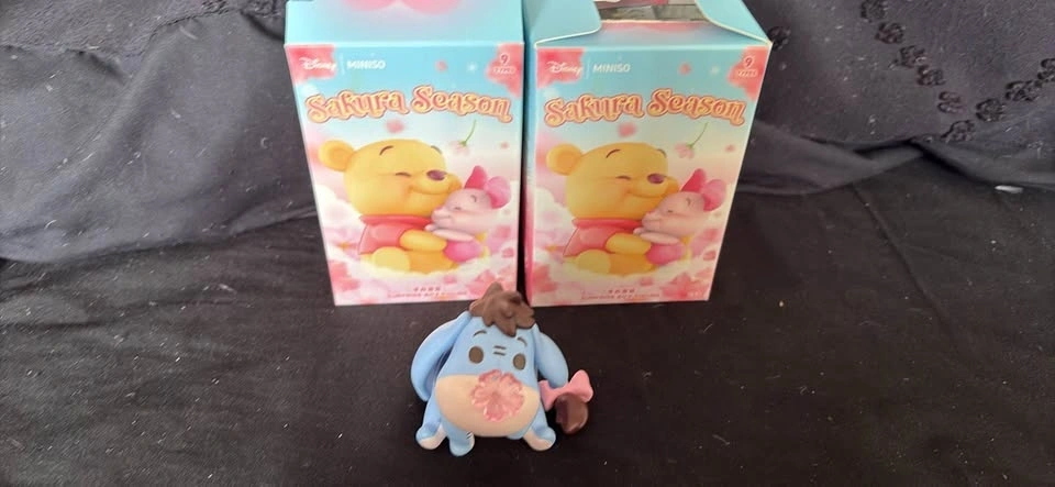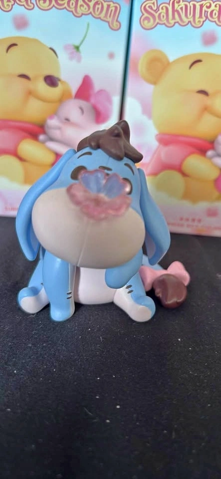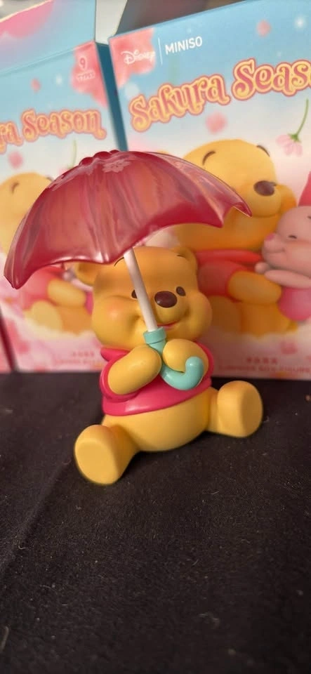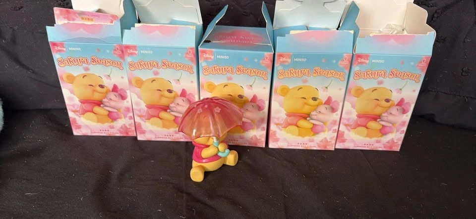 Selling Miniso Sakura season Winnie the Pooh figures. 8 figures total. 7 are in open boxes, unpackaged. 1 is no box, no card. 2 Eeyore figures in open boxes - $8 each. 5 Winnie the Pooh with umbrella figures in open boxes, unpackaged - $8 each. 1 Winnie the Pooh with umbrella, no box, no card - $5.