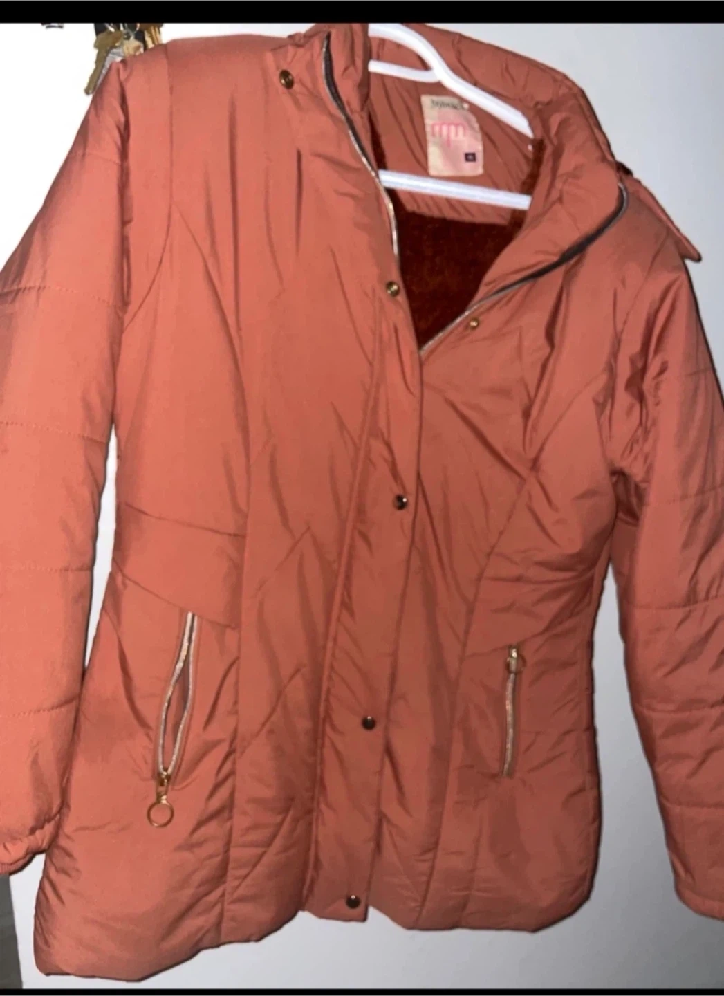 This puffer jacket is a lovely shade of terracotta, perfect for staying warm. It's got a cozy, plush lining and zip pockets for your essentials. The exterior is a smooth, water-resistant material.