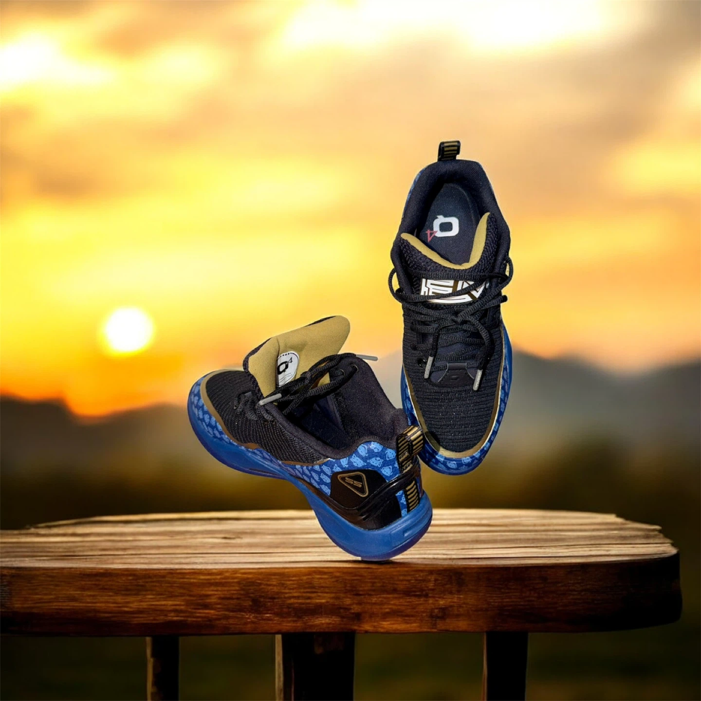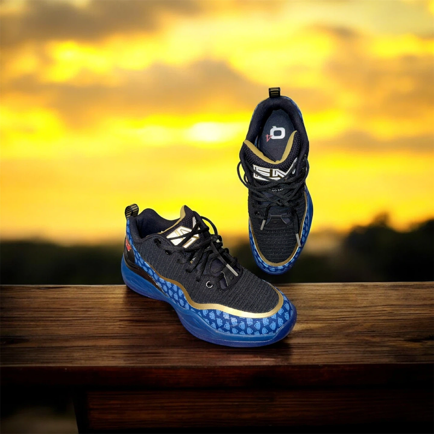 Black and blue IQQ basketball shoes with gold accents. Features a breathable mesh upper and a supportive sole for performance. These shoes are designed for athletic activity.