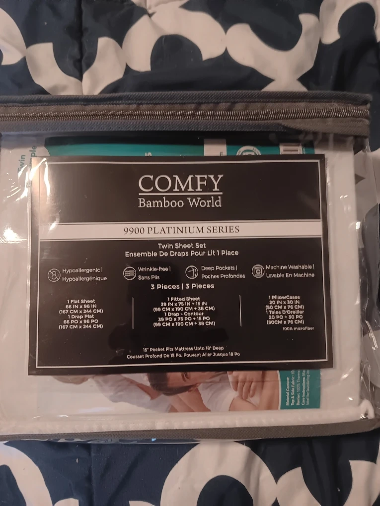 Selling a brand new Comfy Bamboo World twin sheet set! It's still in its original packaging. The set includes 1 flat sheet (66 IN x 96 IN), 1 fitted sheet (39 IN x 75 IN + 16 IN), and 1 pillowcase (20 IN x 30 IN). The material is 100% microfiber and the set is machine washable. It's also hypoallergenic and wrinkle-free