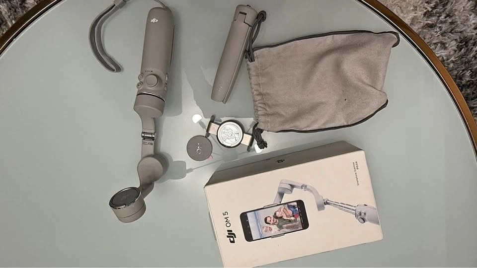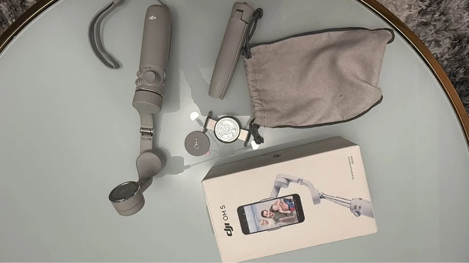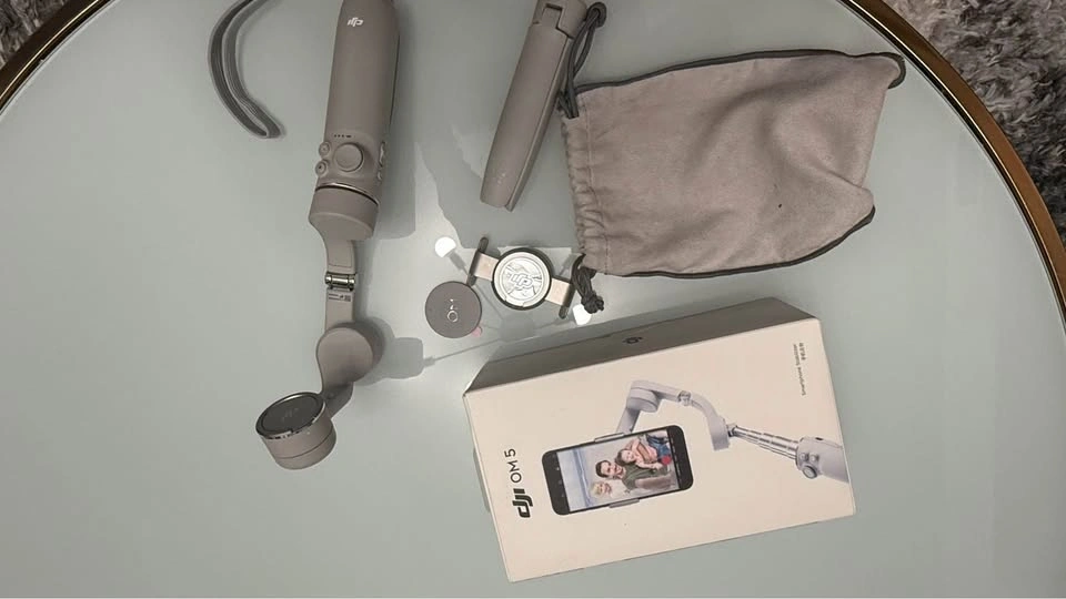 DJI OM 5 smartphone stabilizer in Athens Gray. This 3-axis gimbal has a built-in extension rod for versatile angles. It includes the magnetic phone clamp, tripod grip, storage pouch, and original box. Pick up location: Parklawn and Lakeshore.