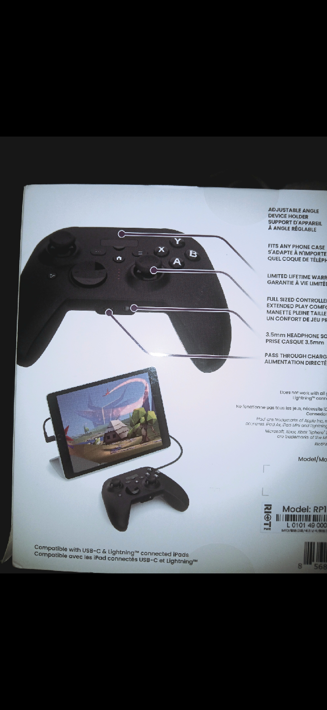 Selling a RiotPWR RP19001 game controller. It's compatible with USB-C & Lightning connected iPads. Features an adjustable angle device holder and fits any phone case. It also has a full-sized controller for extended play comfort and a 3.5mm headphone socket for private listening