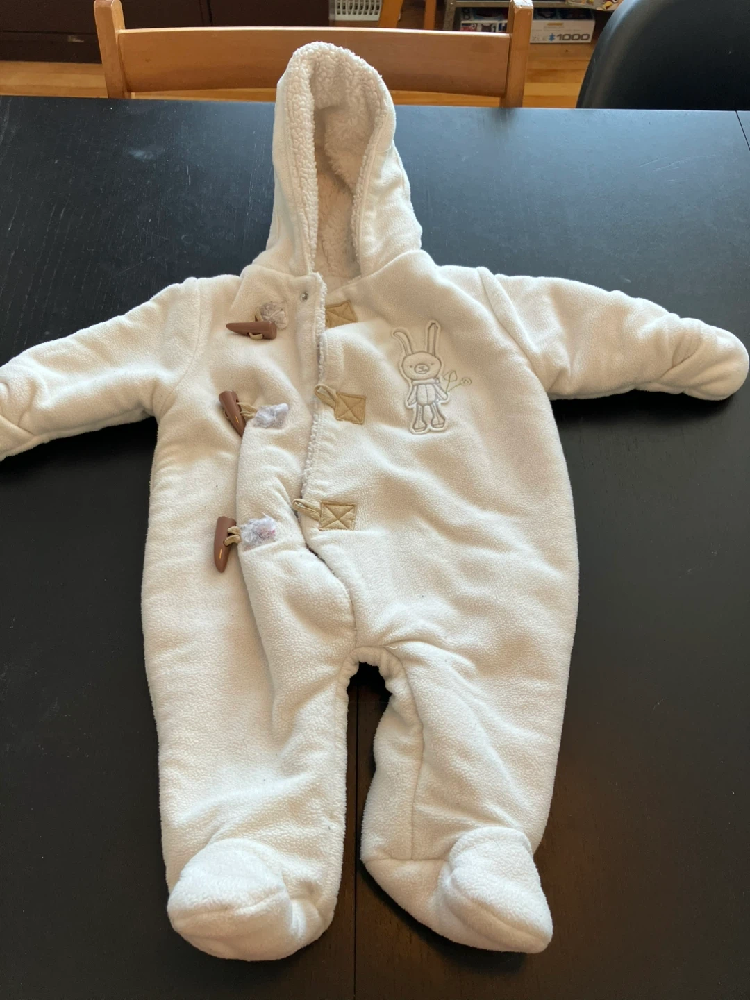White fleece snowsuit/bunting suit with toggle closures and hood. 100% polyester. Made in China. Fits 0-3 months, 7-12 lbs.