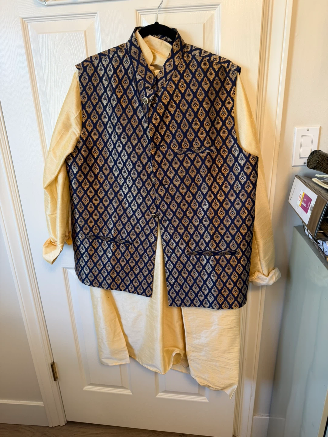 1 / 11 / 1Buy & SellMen's Traditional Kurta Vest SetMen's Traditional Kurta Vest Set$40A cream-coloured kurta paired with a navy blue vest featuring a gold diamond pattern. The jacket has a mandarin collar and button closure.Size44WHERE TO MEETCheck LocationView MapSELLERverifiedJMTynehead1114 reviews0 chats·0 favorites·11 viewsSEND CHAT TO SELLERHi JM! I’m interested in your listing.Hi JM! I’m interested in your listing.Get the Karrot app to chatSign In to chat