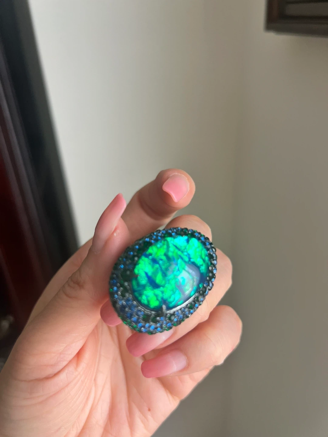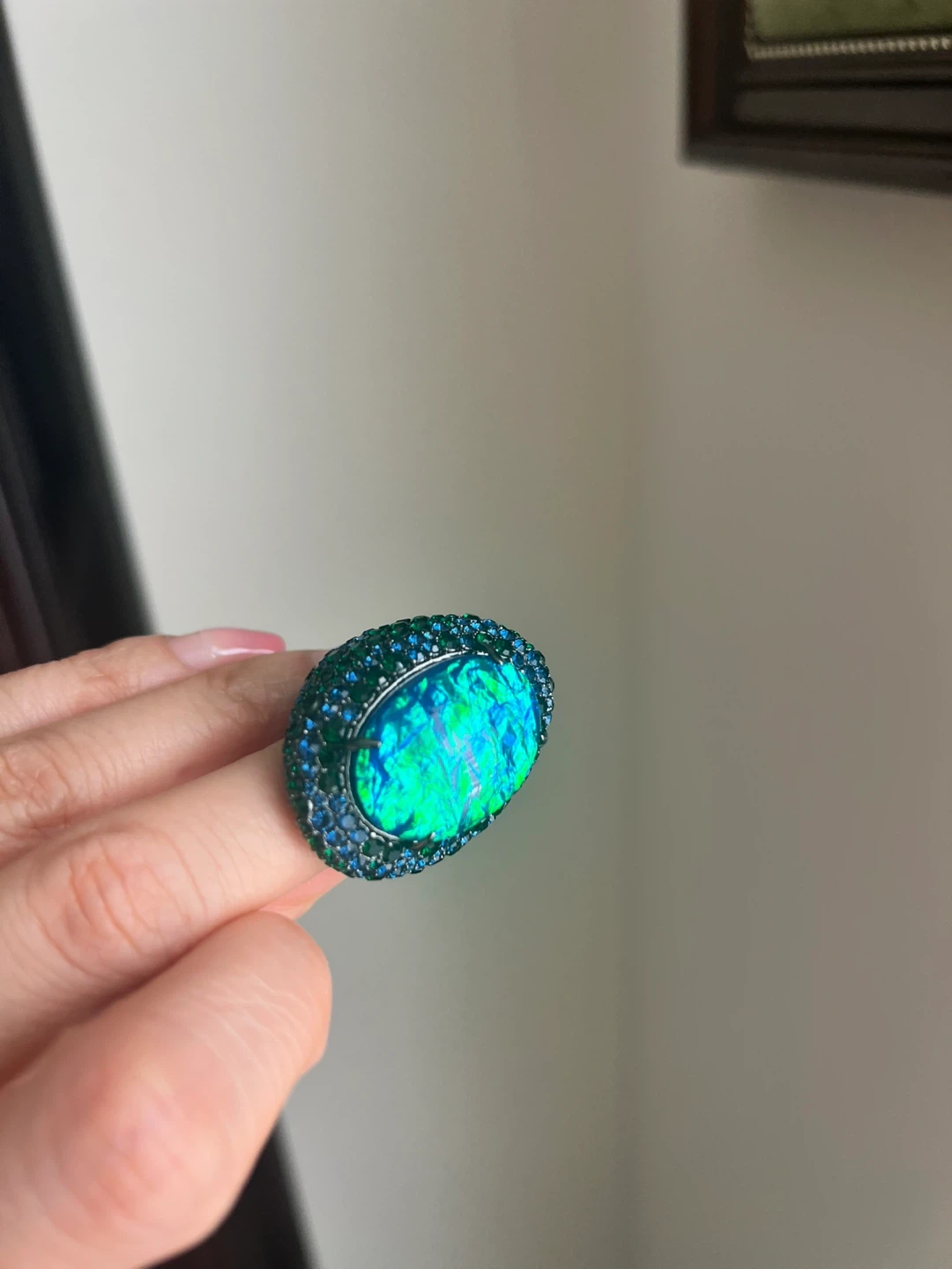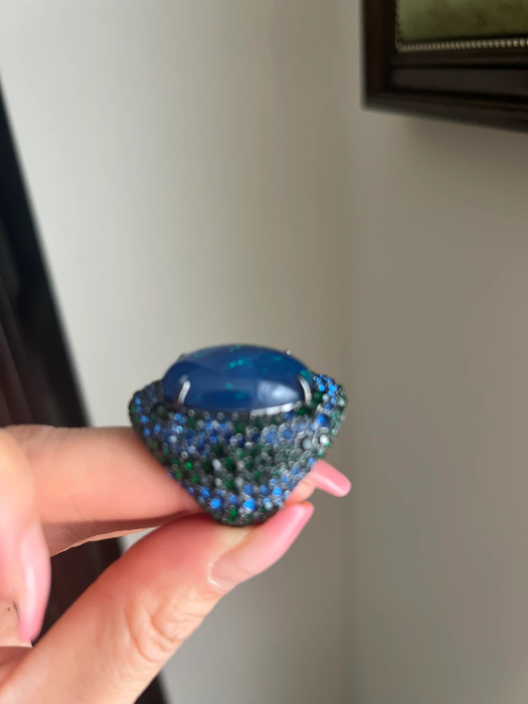 This statement ring features a large blue stone surrounded by green and blue accent stones. The intricate metalwork adds a touch of elegance. It's a real eye-catcher!