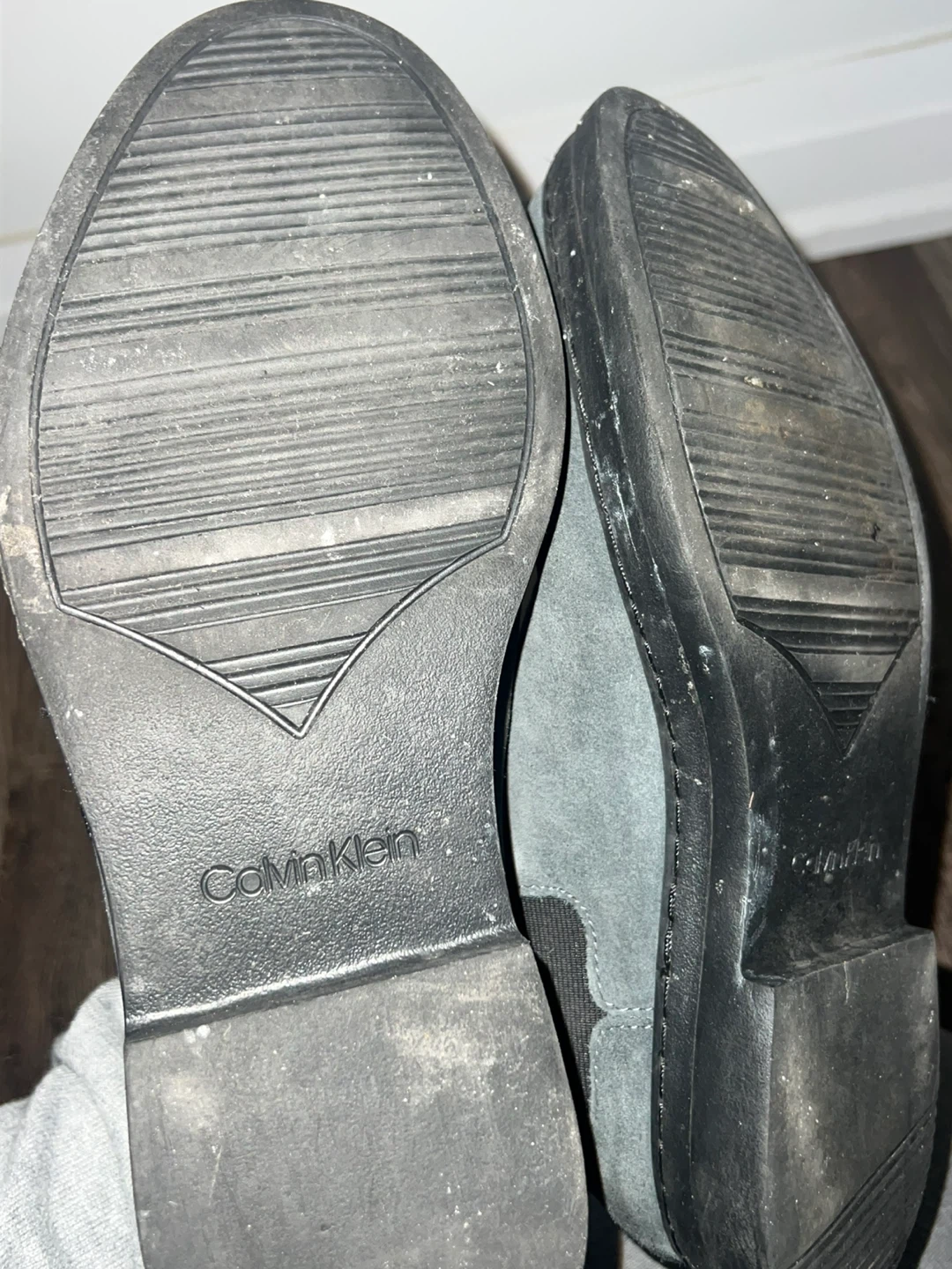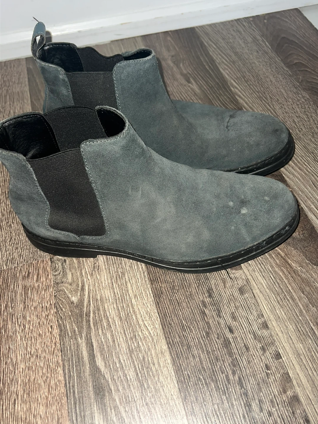 Calvin Klein Chelsea boots. Suede upper with elastic side panels. Rubber sole.