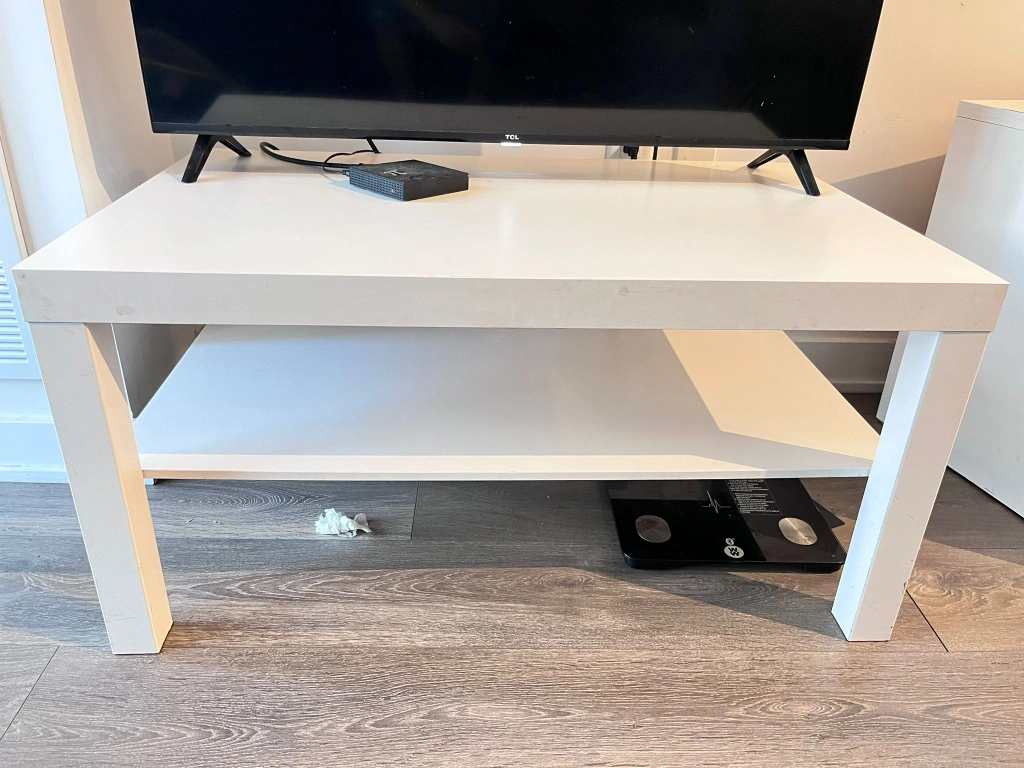 Selling a sturdy white coffee table! It has a convenient shelf underneath for storage or decor. It's in good condition and ready for a new home