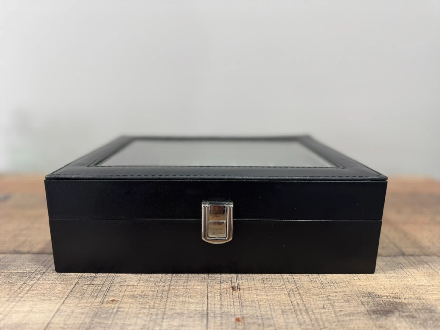 Used black watch display box holds up to 12 watches. It features a glass lid to showcase your collection. The interior has soft cushions to protect each watch. A silver latch keeps the box securely closed.