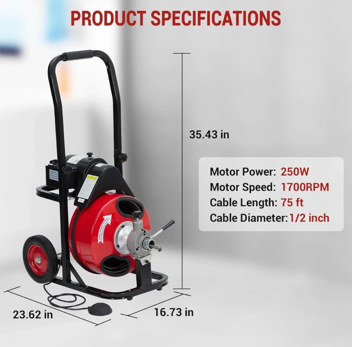 This drain cleaning machine has a 75 ft cable with a 1/2 inch diameter. It features a 250W motor that runs at 1700 RPM. This tool is suitable for clearing clogs in sewer pipes, drain pipes, and floor drains.