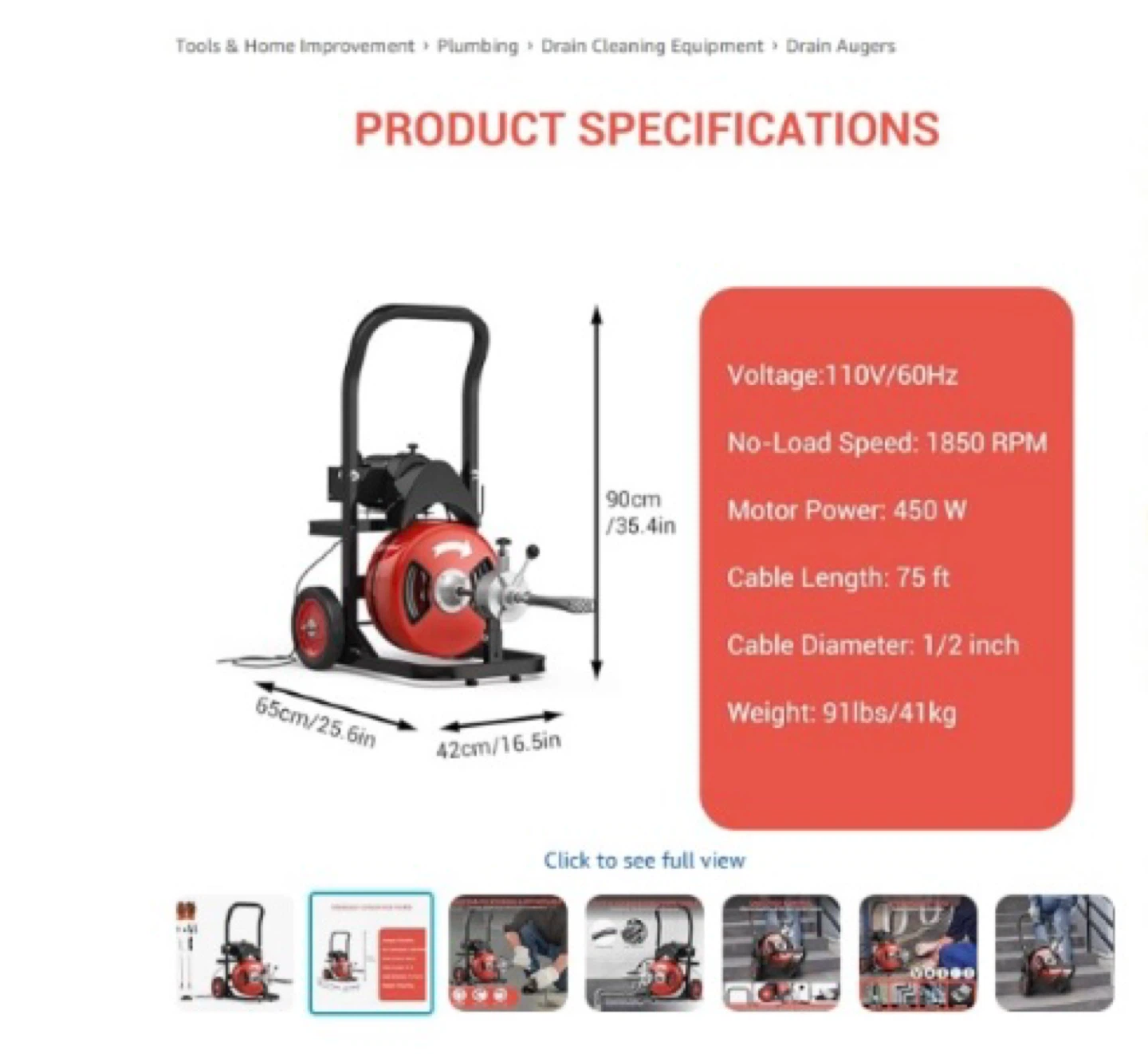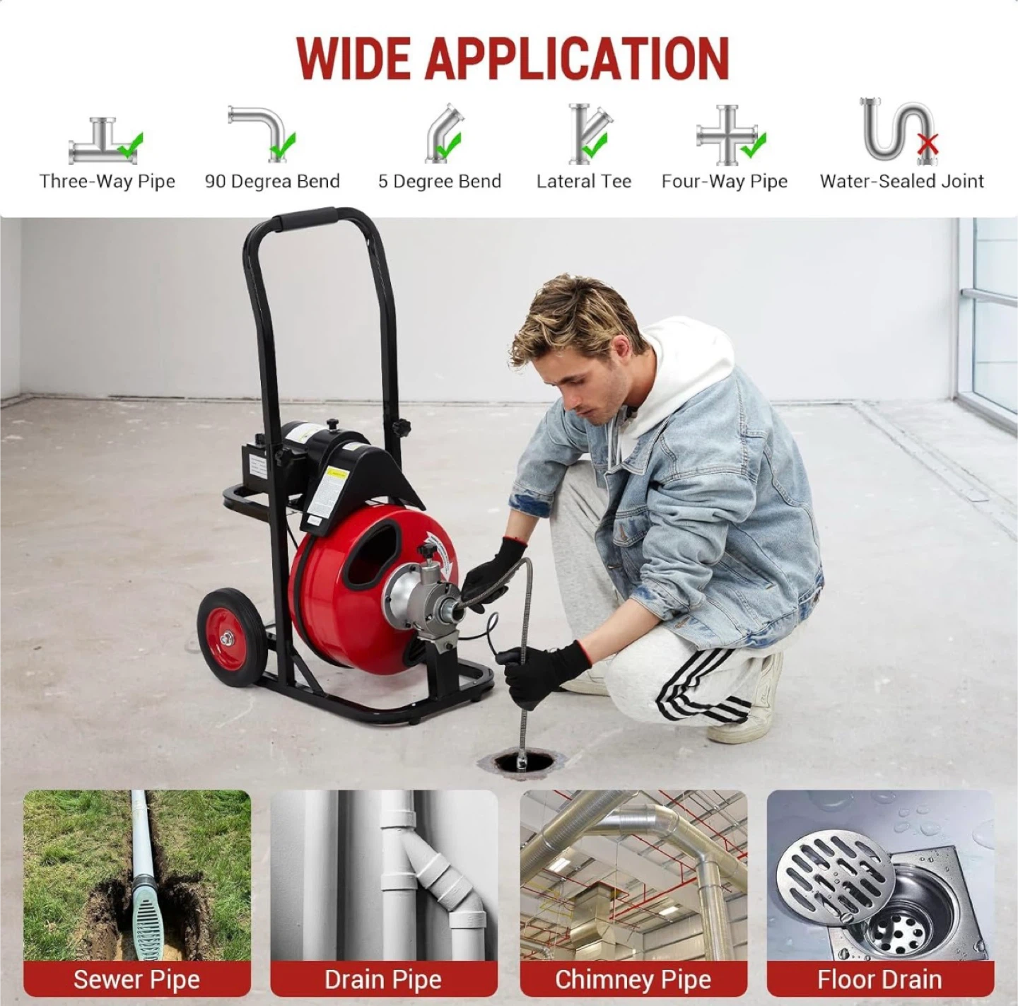 This drain cleaning machine has a 75 ft cable with a 1/2 inch diameter. It features a 250W motor that runs at 1700 RPM. This tool is suitable for clearing clogs in sewer pipes, drain pipes, and floor drains.