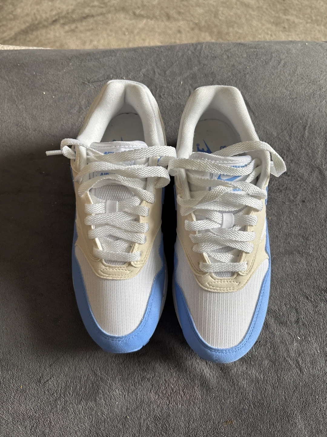 Women's Nike Air Max 1 sneakers in white with royal pulse blue and phantom accents. Features mesh and suede materials. Brand new never worn. Purchased for $120 plus tax.
