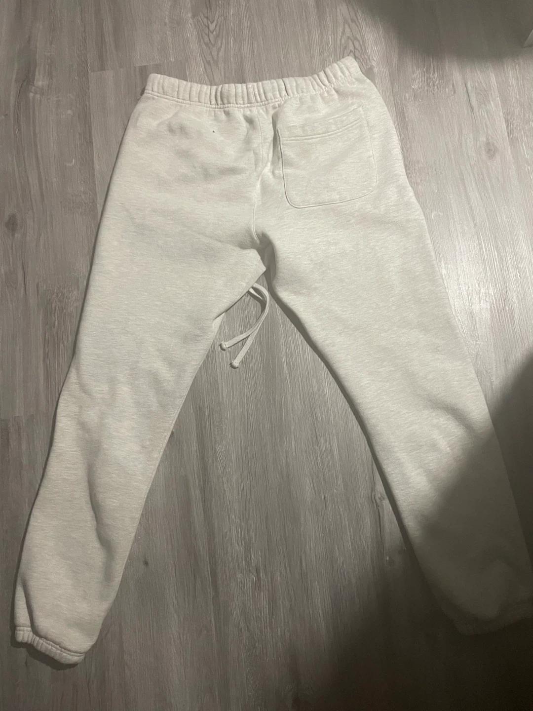 These ESSENTIALS sweatpants are a size medium and come in a light grey colour. They're made from a soft fleece material, perfect for casual wear. The drawstring waistband ensures a comfortable fit.