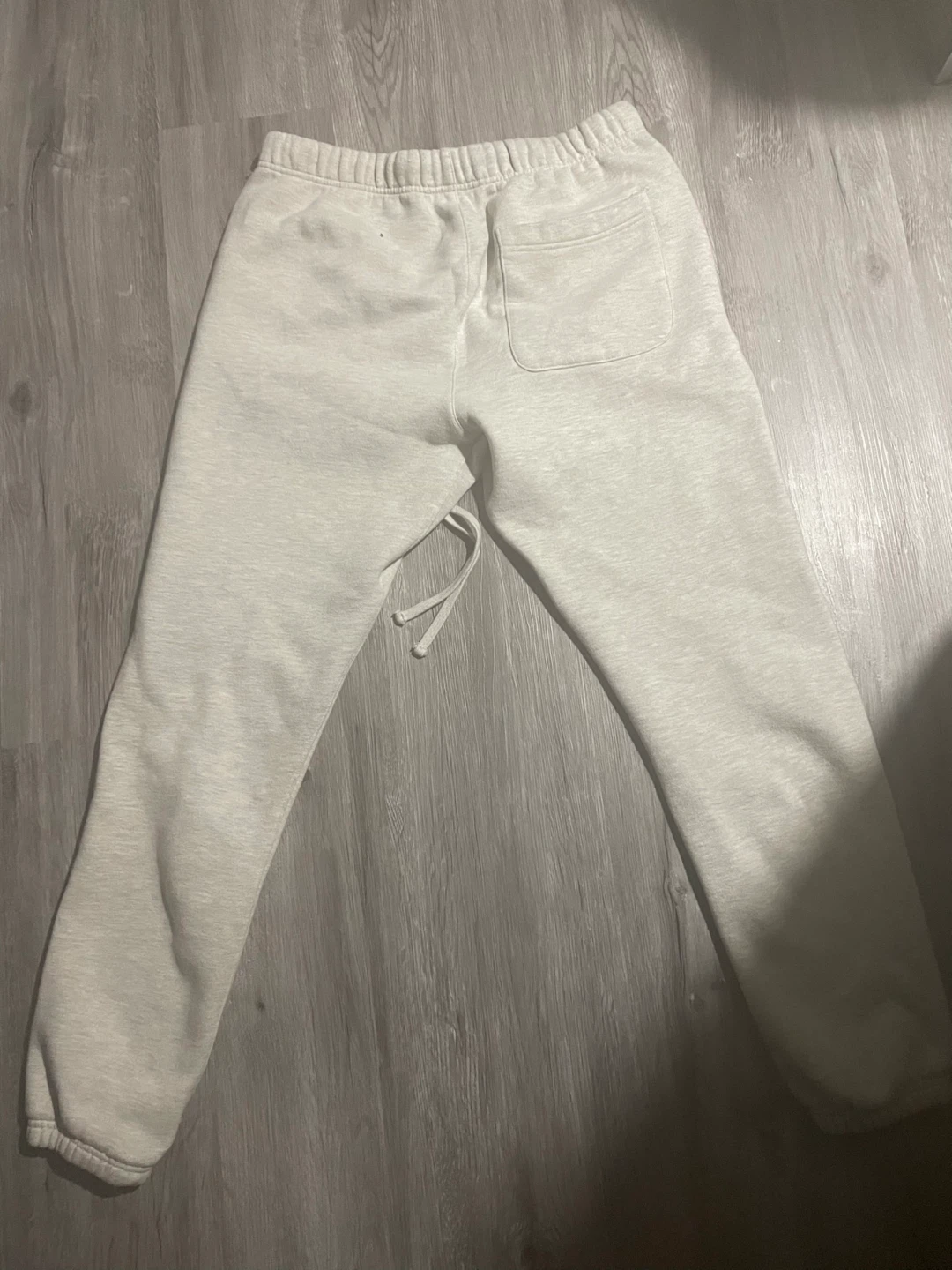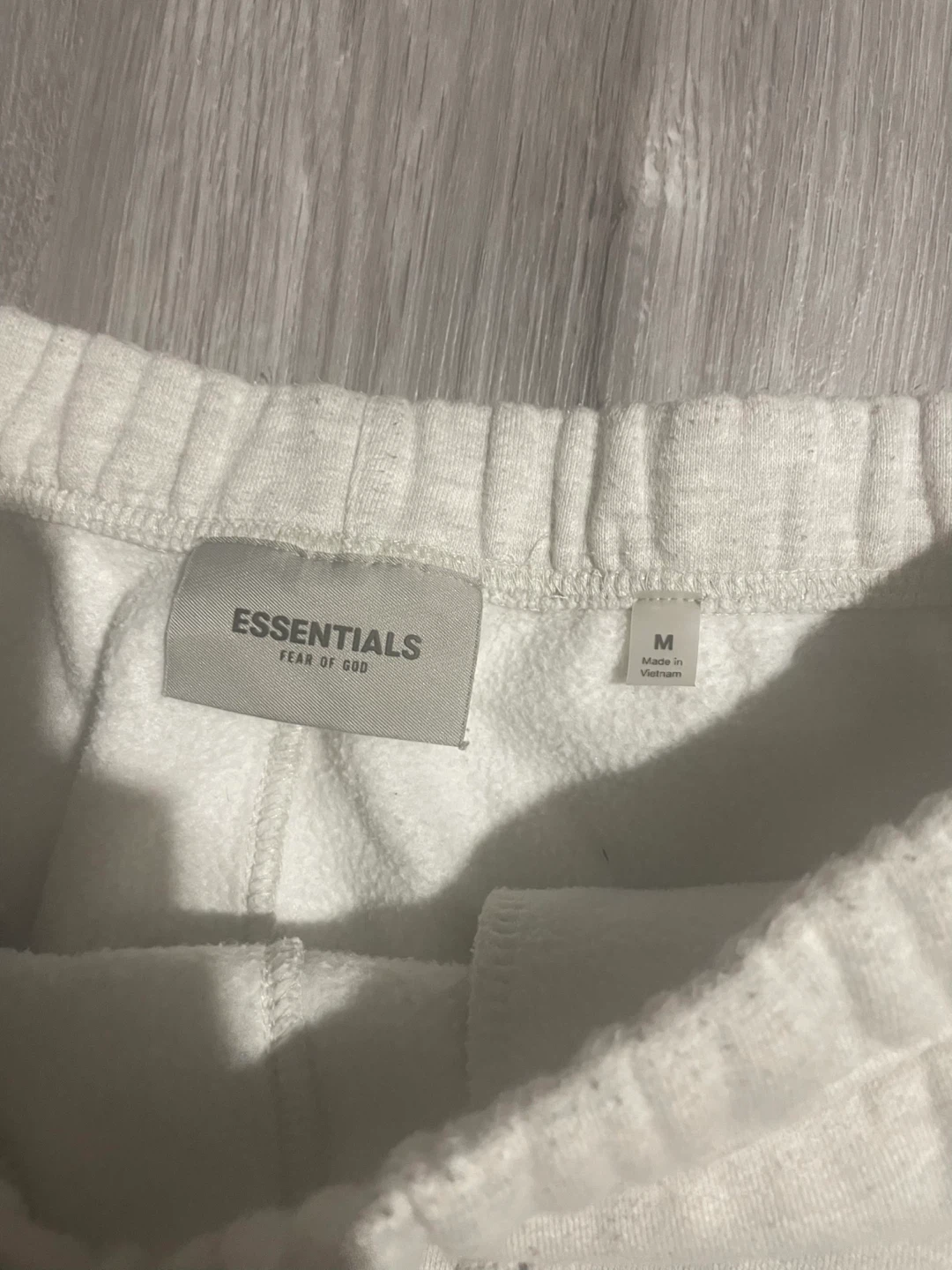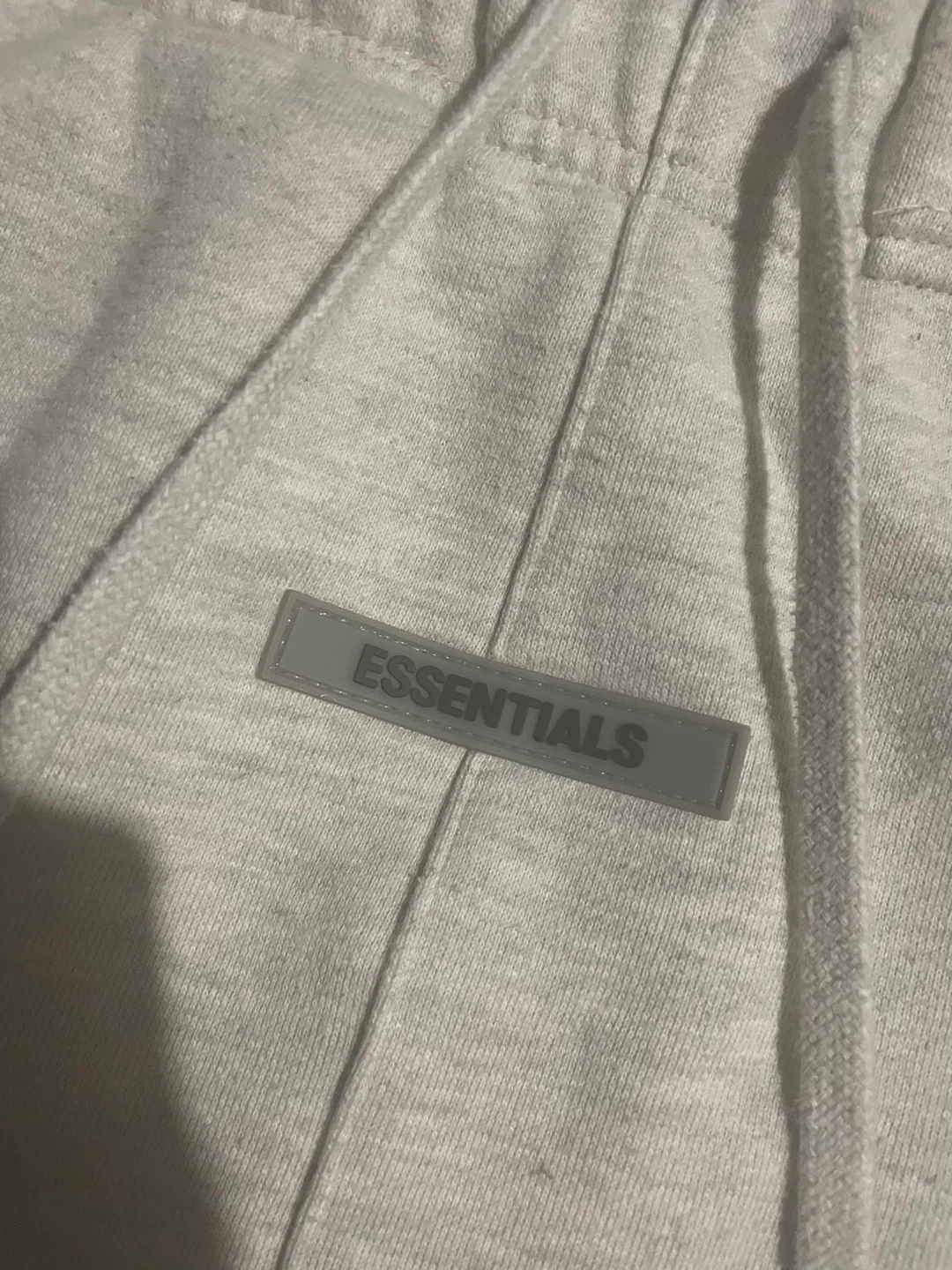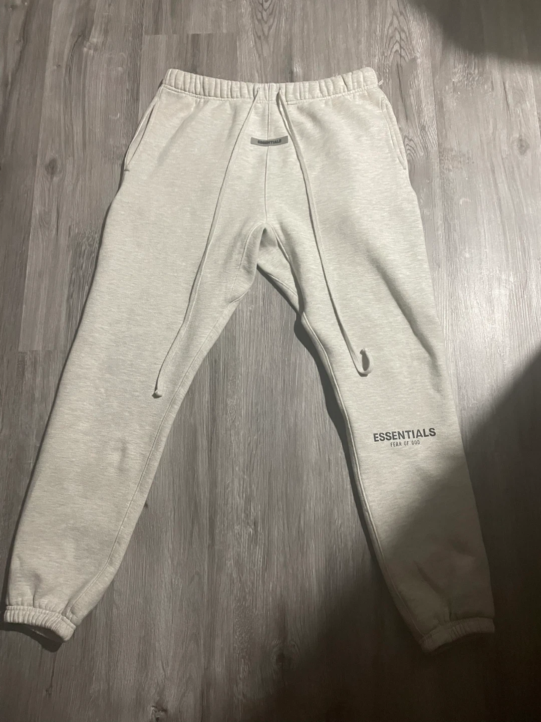 These ESSENTIALS sweatpants are a size medium and come in a light grey colour. They're made from a soft fleece material, perfect for casual wear. The drawstring waistband ensures a comfortable fit.