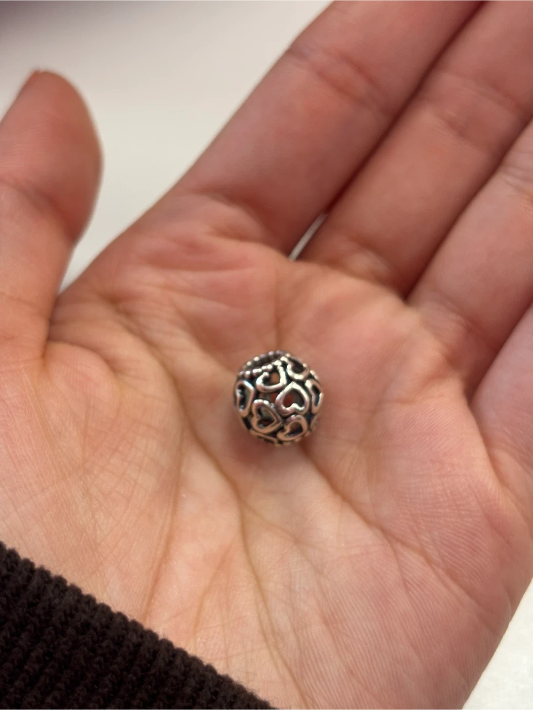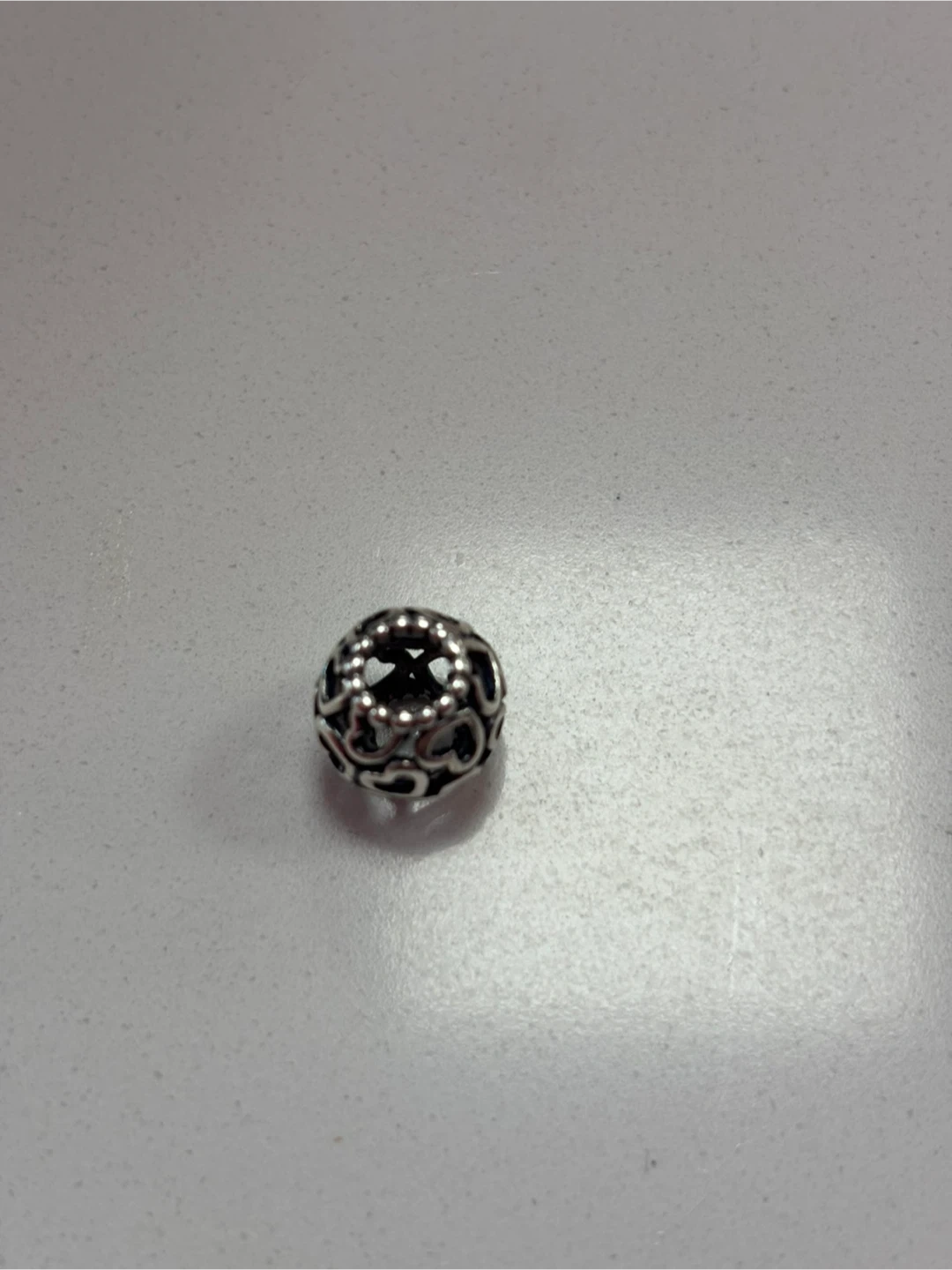 This is a silver-tone charm bead. It features an openwork design with multiple small hearts. The bead's core is black.