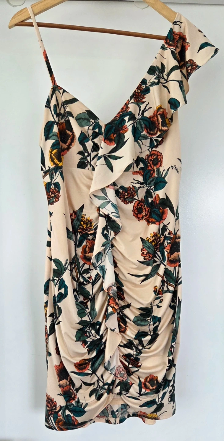 A stylish cream-coloured Guess dress featuring a vibrant floral print. It's designed with a flattering one-shoulder neckline and ruched detailing down the front. This dress is perfect for a night out or a special occasion!