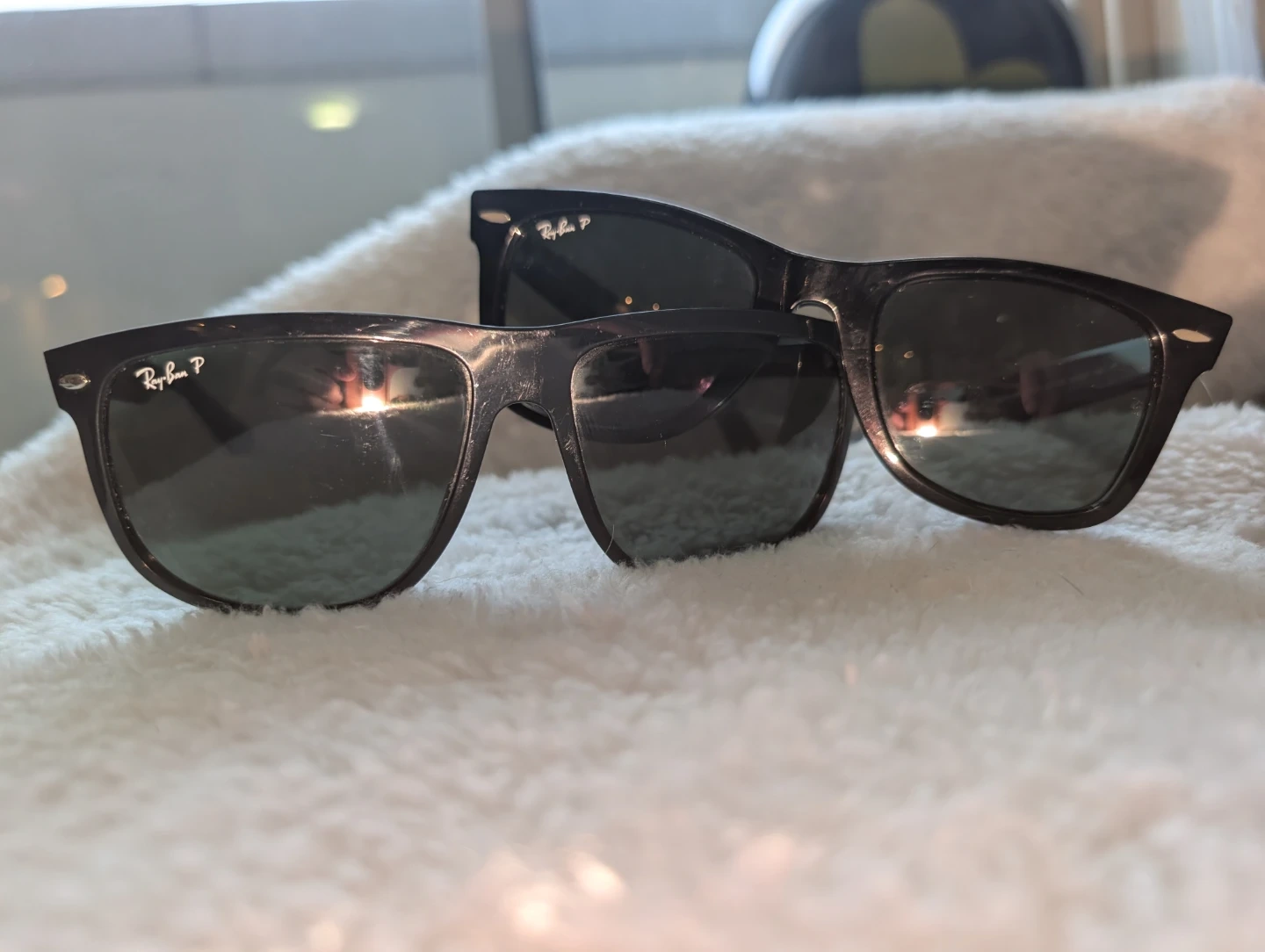 Selling two pairs of black Ray Ban Wayfarer sunglasses. These are polarized with "Ray-Ban P."