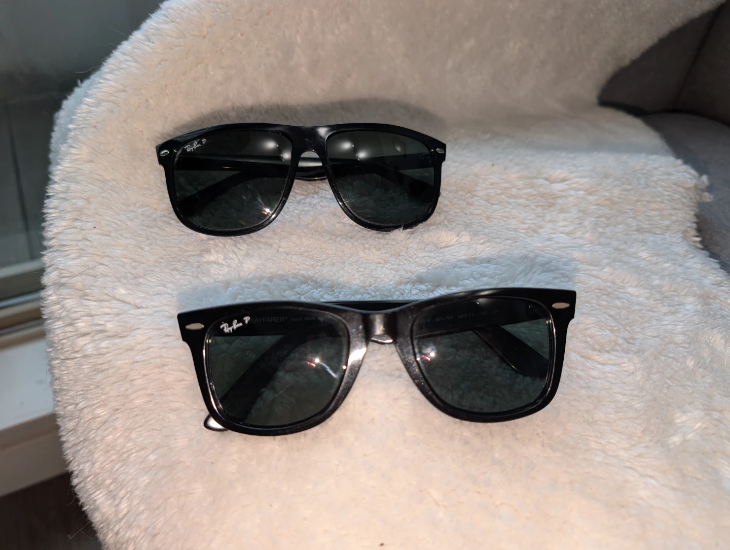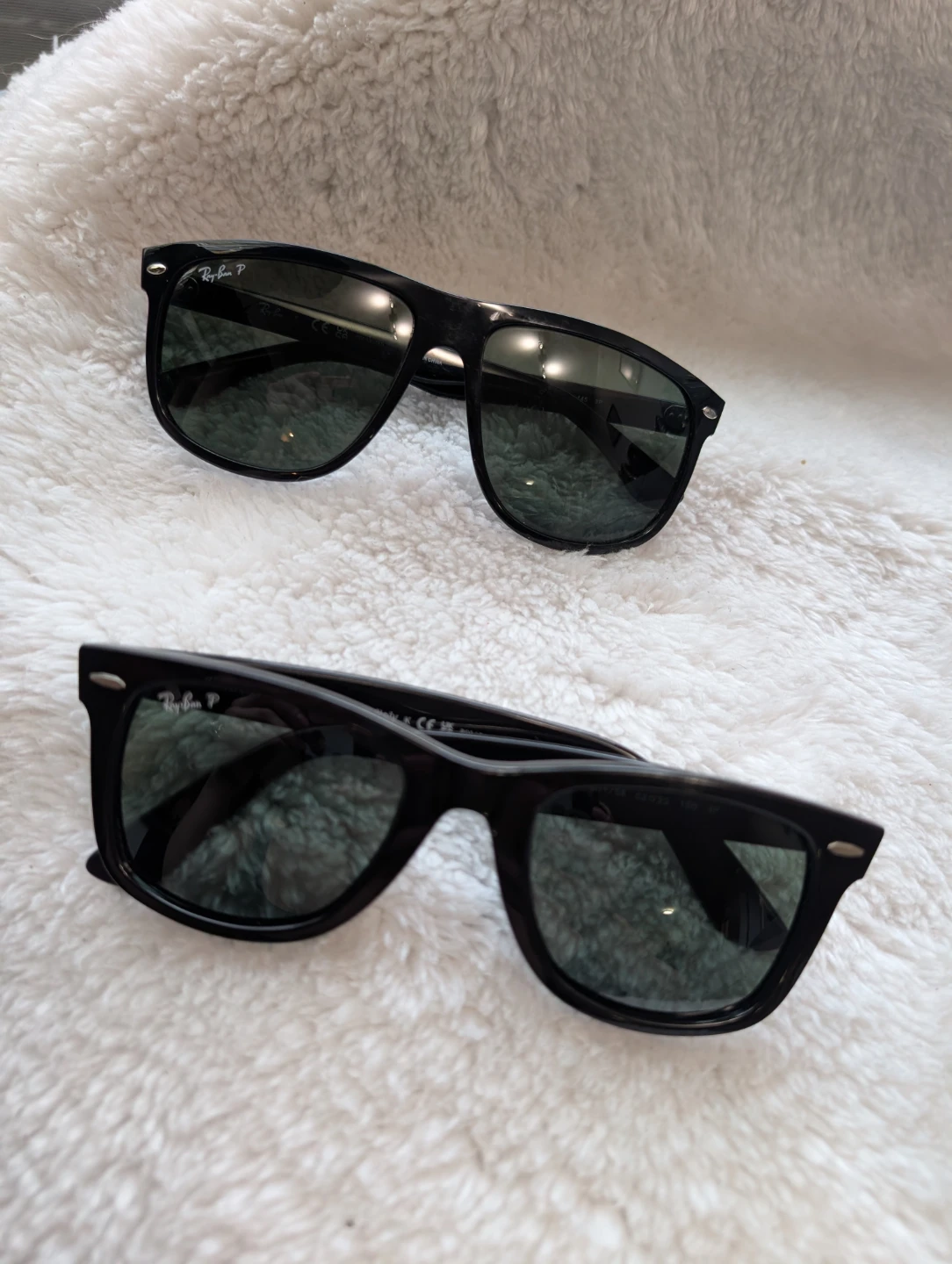 Selling two pairs of black Ray Ban Wayfarer sunglasses. These are polarized with "Ray-Ban P."