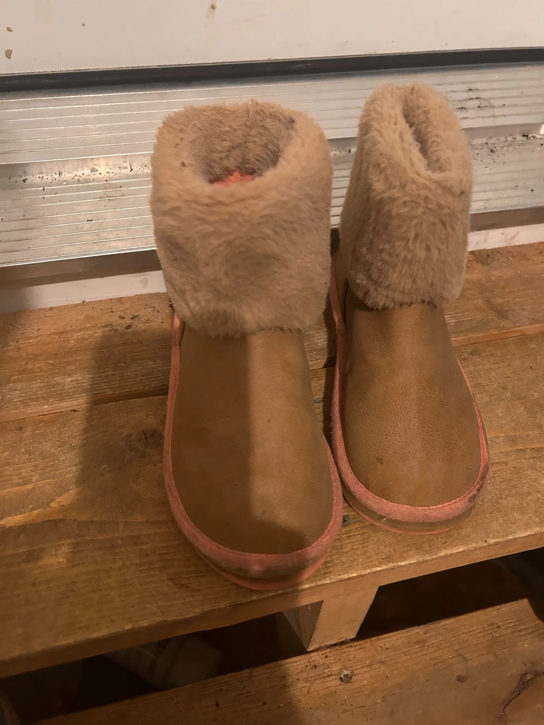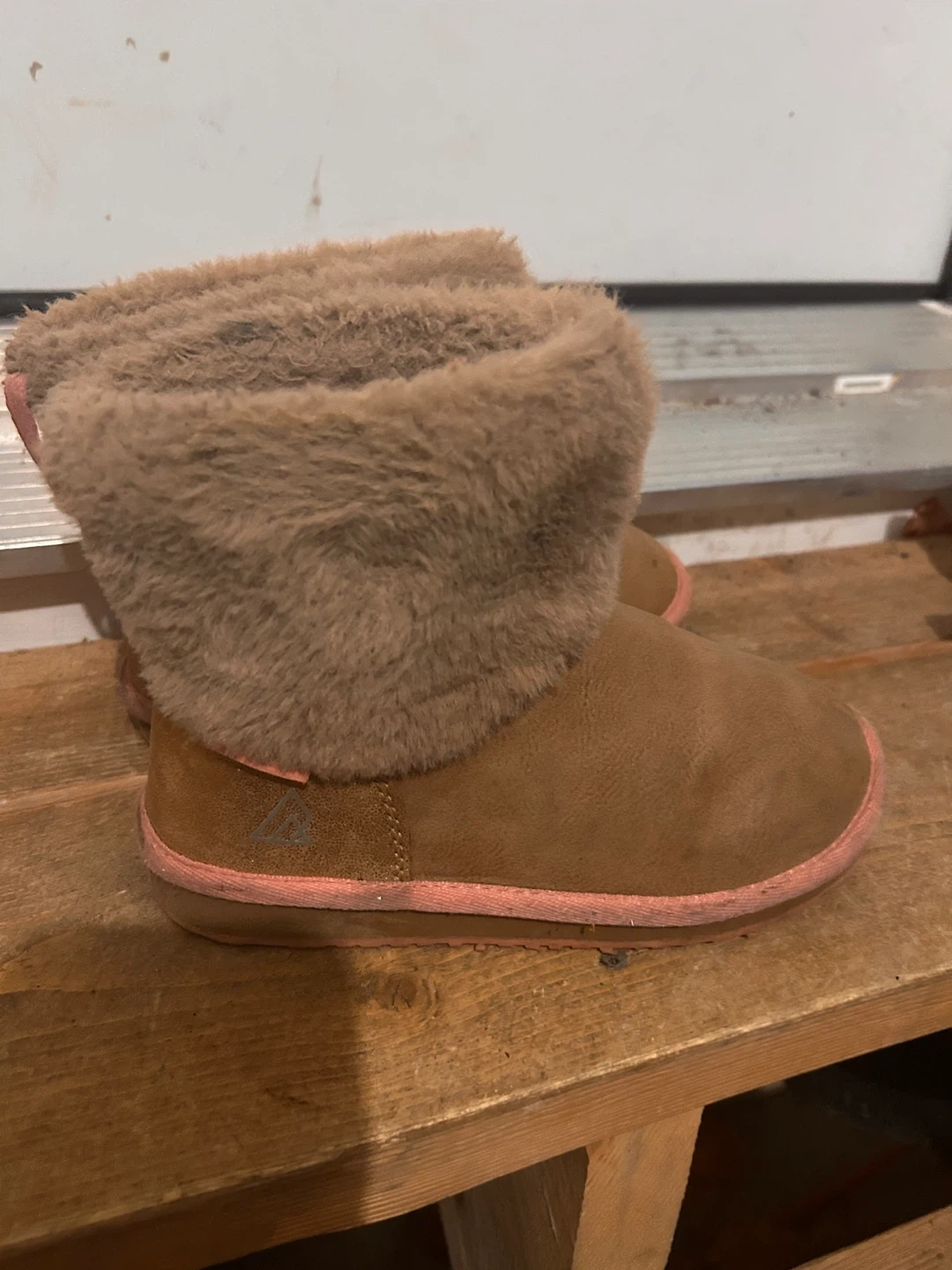 Cozy Ripzone girls' winter boots in a tan suede-like material with fluffy faux fur lining. The boots feature a contrasting pink sole and trim. These boots are perfect for keeping little feet warm during colder months!