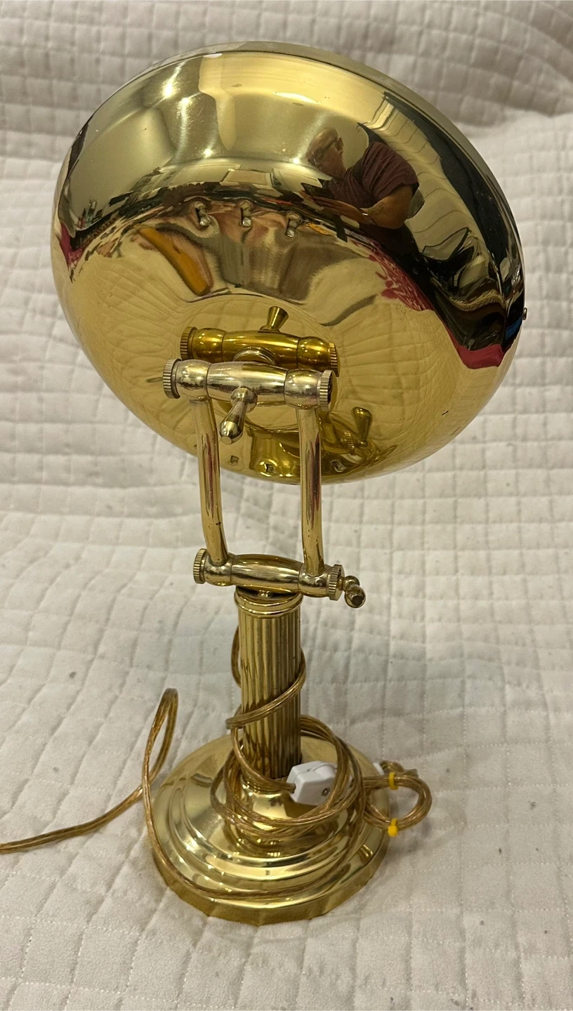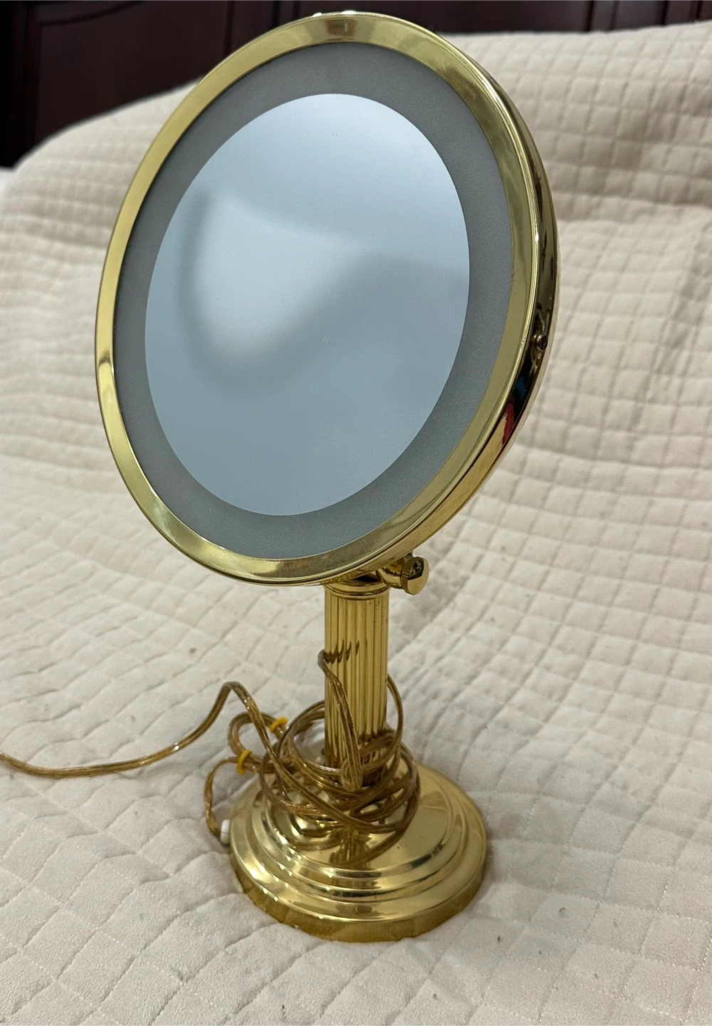 This is a vintage-style gold vanity mirror with a magnifying side. It's perfect for applying makeup or any detailed grooming. The mirror has a polished gold finish and a sturdy base.