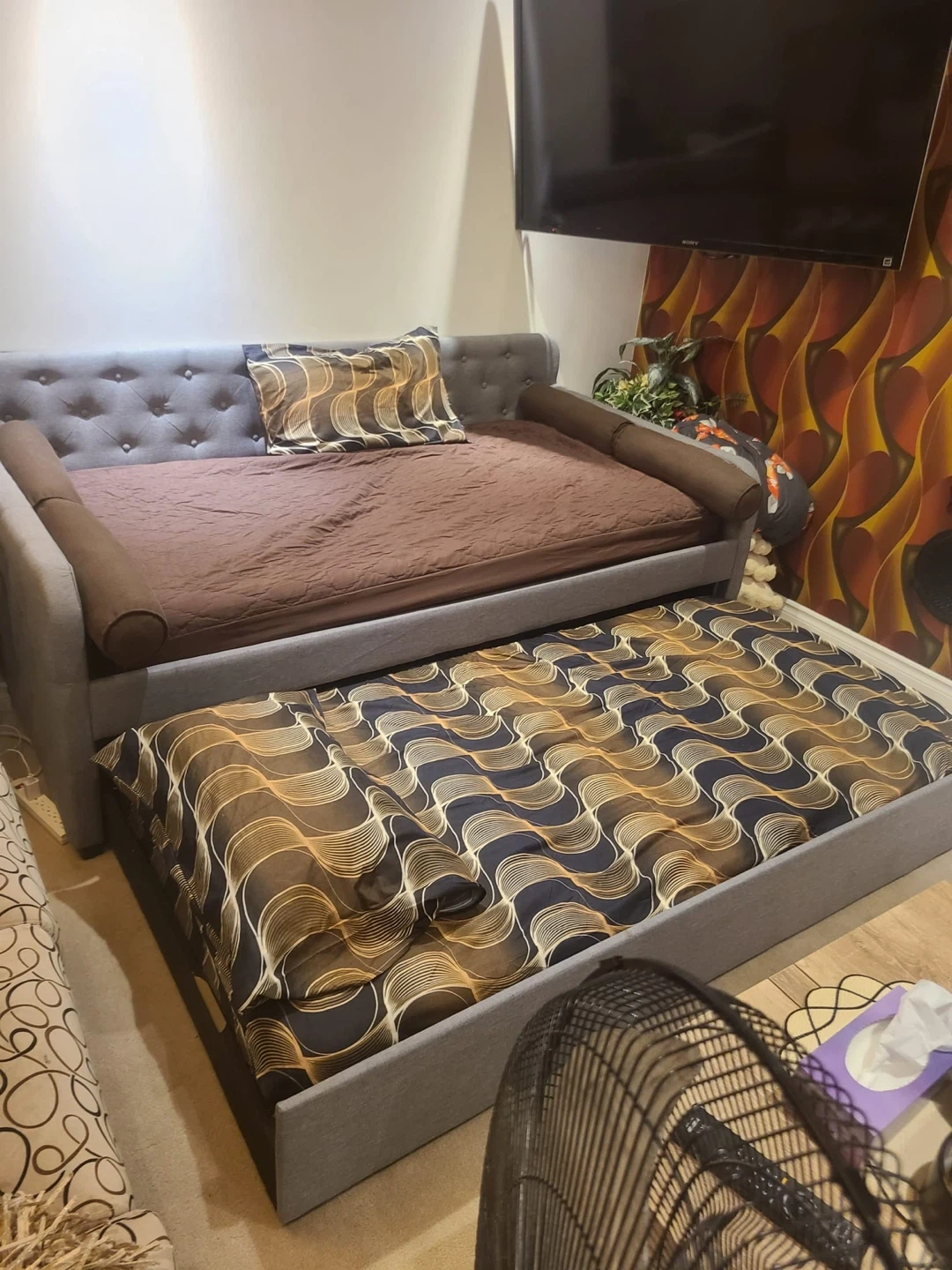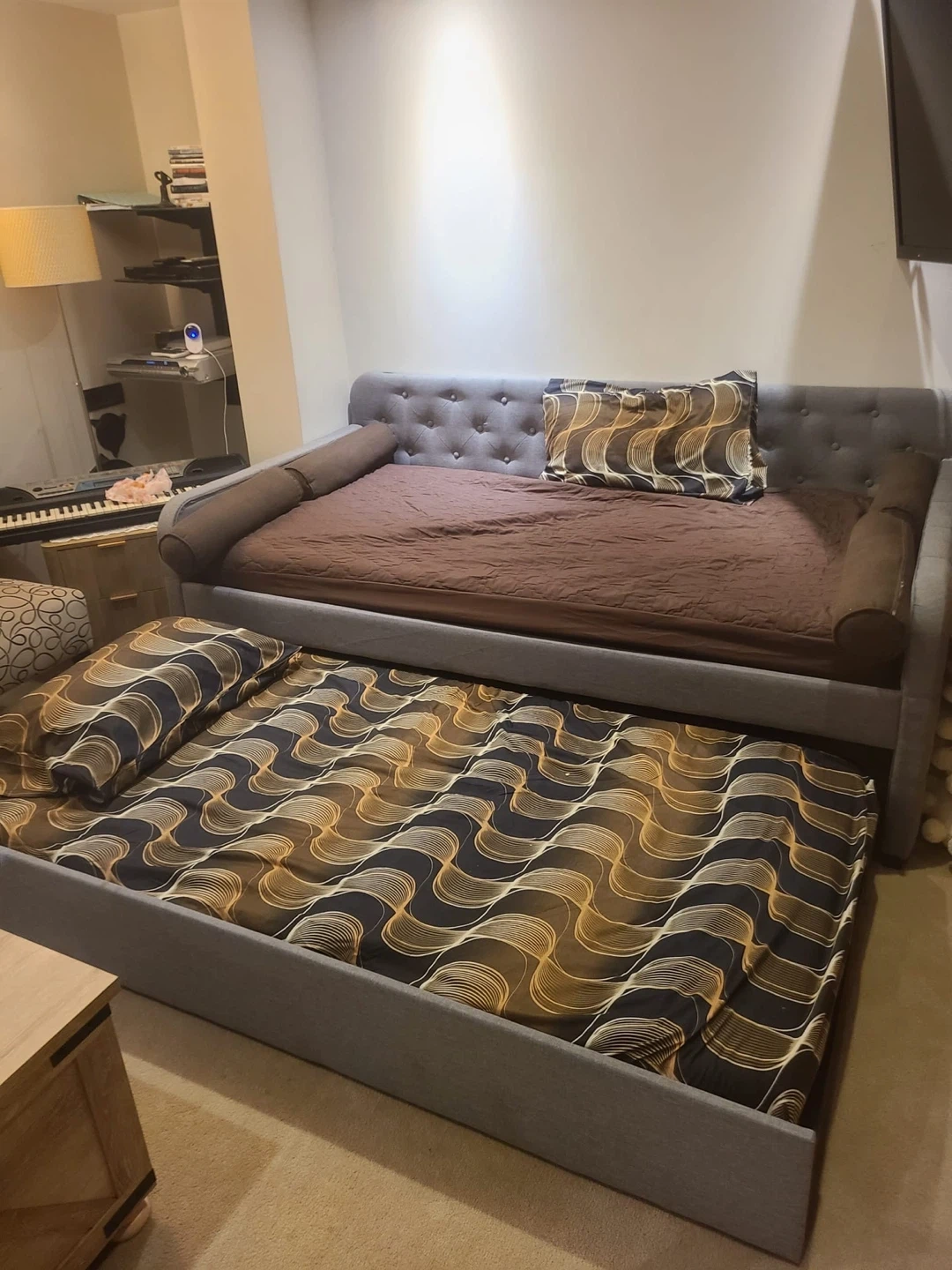 This is a grey daybed with a pull-out trundle, perfect for accommodating guests. It's upholstered in a durable fabric and features a tufted backrest. The trundle slides out easily for extra sleeping space.