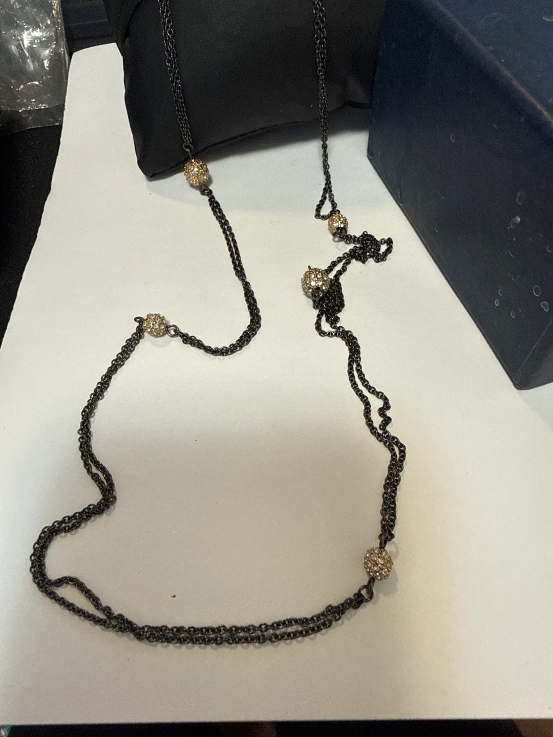 This is a long, dark-toned necklace featuring multiple small balls adorned with diamante accents. The chain has a delicate double-strand design. It's a stylish accessory that adds a touch of sparkle. Perfect for layering or wearing on its own!