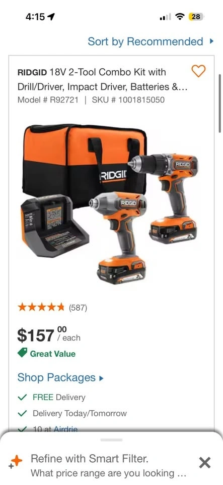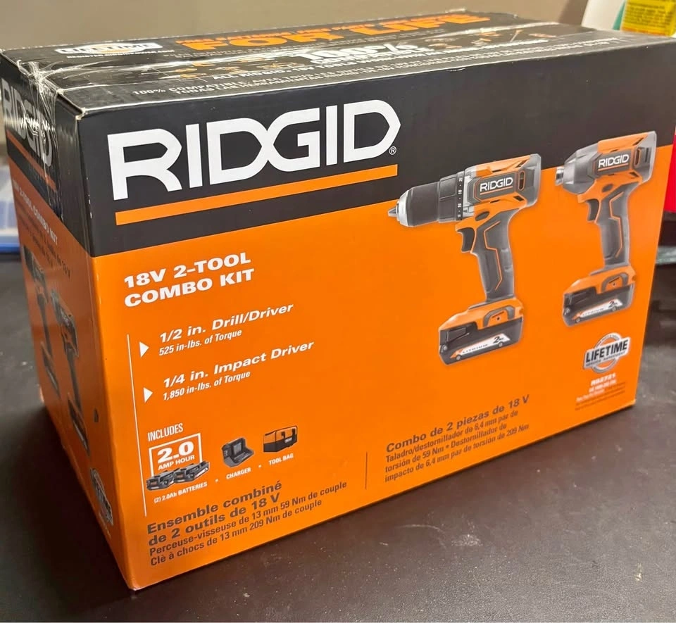 Brand new RIDGID 18V 2-Tool Combo Kit, still sealed in the original box. Includes a 1/2 inch drill/driver and a 1/4 inch impact driver. Comes with two 2.0Ah batteries, a charger, and a tool bag. Model R92721. Pick up in SW Airdrie.