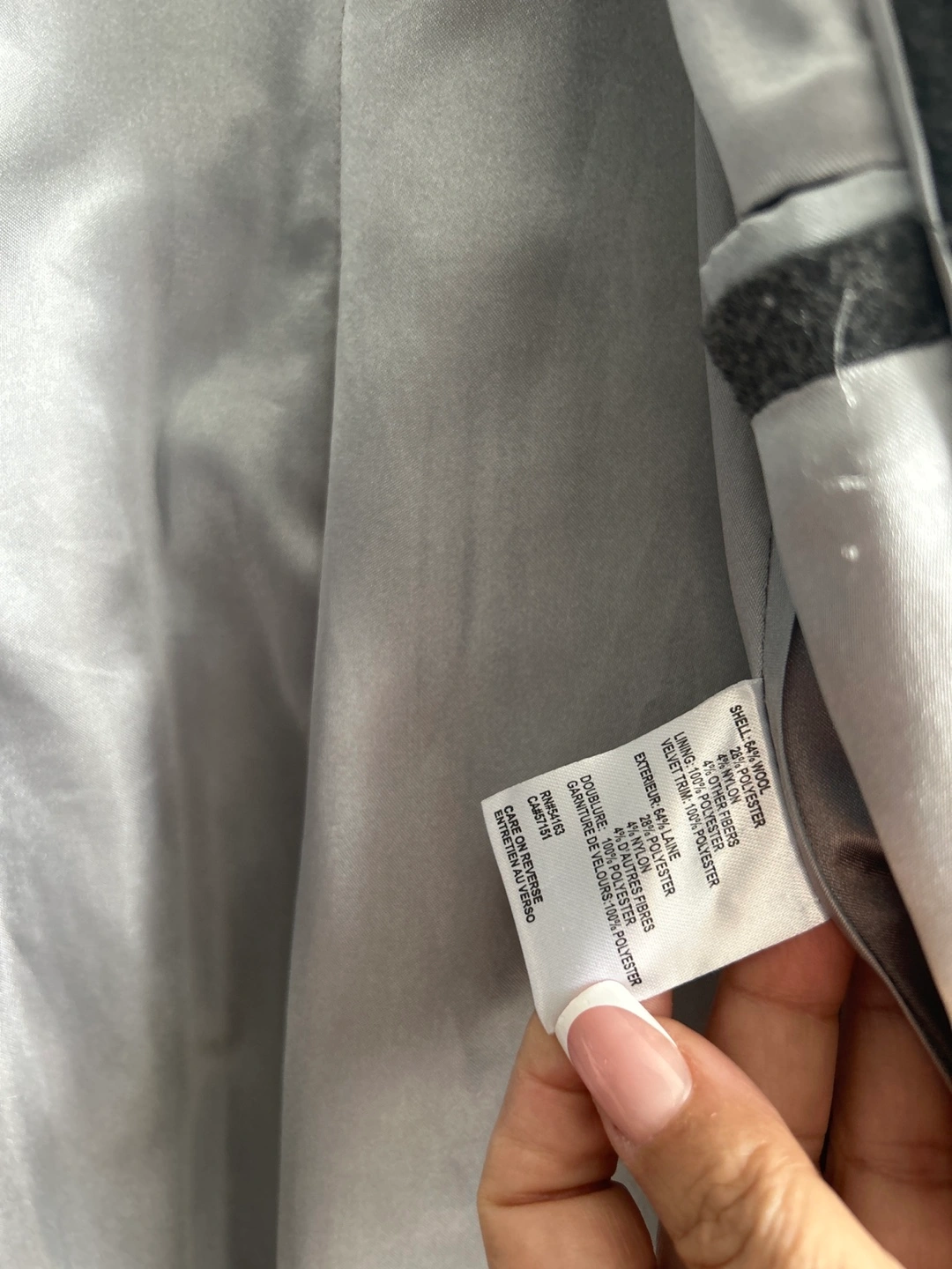 Women's charcoal grey wool blend coat. Features a velvet collar, zipper closure, and silver lining. Two pockets. Long sleeves.
