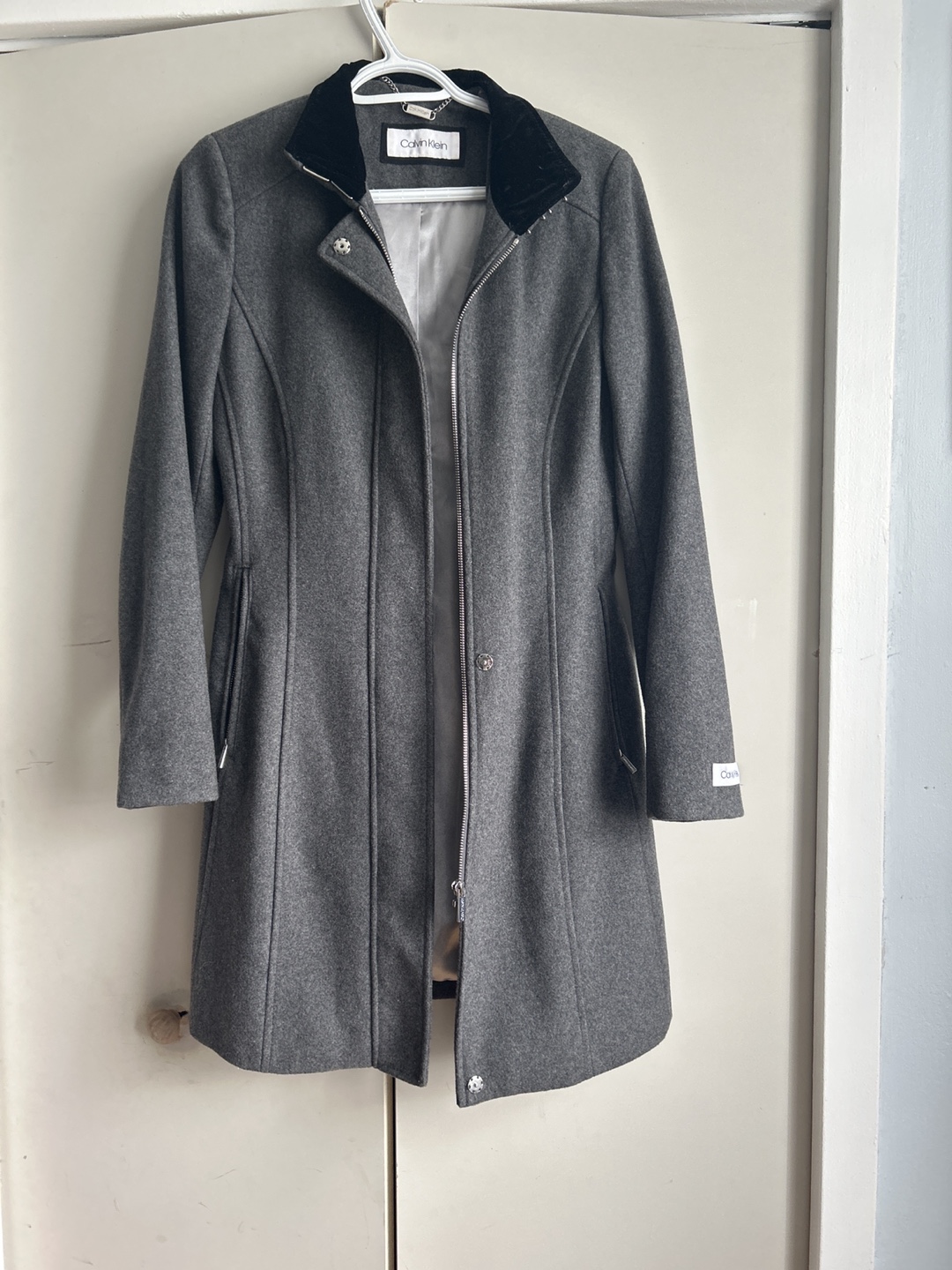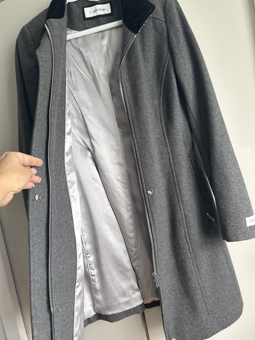 Women's charcoal grey wool blend coat. Features a velvet collar, zipper closure, and silver lining. Two pockets. Long sleeves.