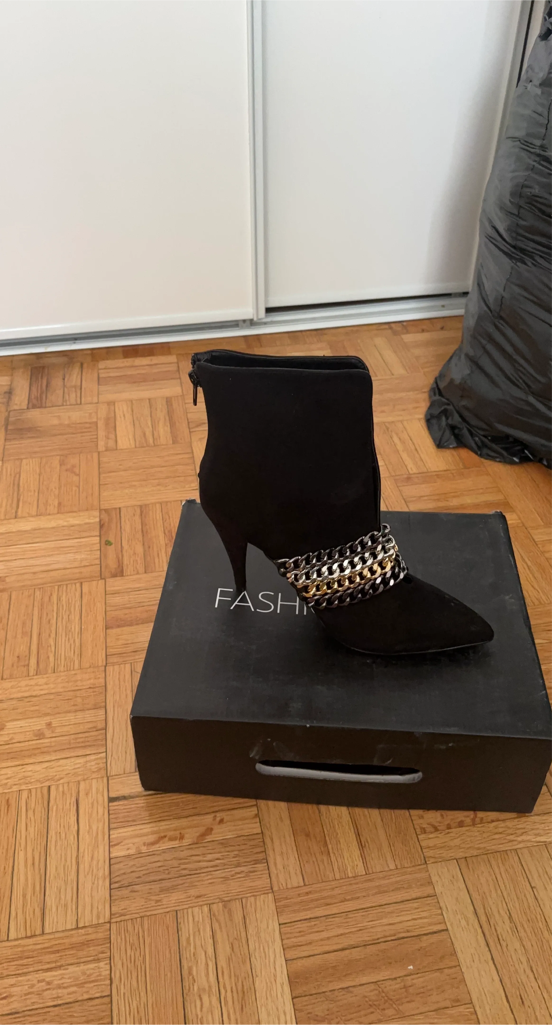 Selling a pair of Fashion Nova black ankle boots. They feature a stylish chain detail around the ankle and come in the original box. Perfect for adding a bit of edge to your outfit! Each boot is for $15