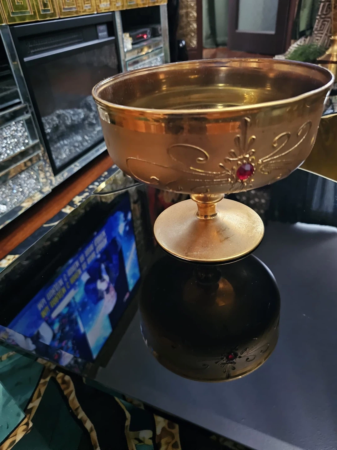 This is a beautiful gold-toned pedestal bowl, perfect for serving or display. It features elegant scrollwork and a vibrant red jewel accent. Its ornate design makes it a lovely centrepiece!