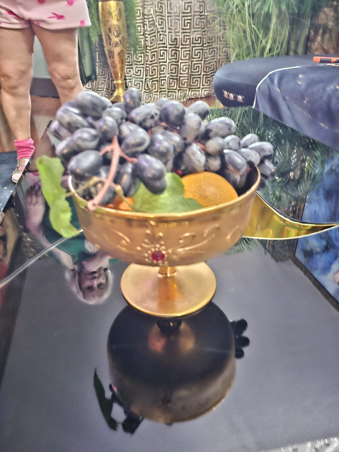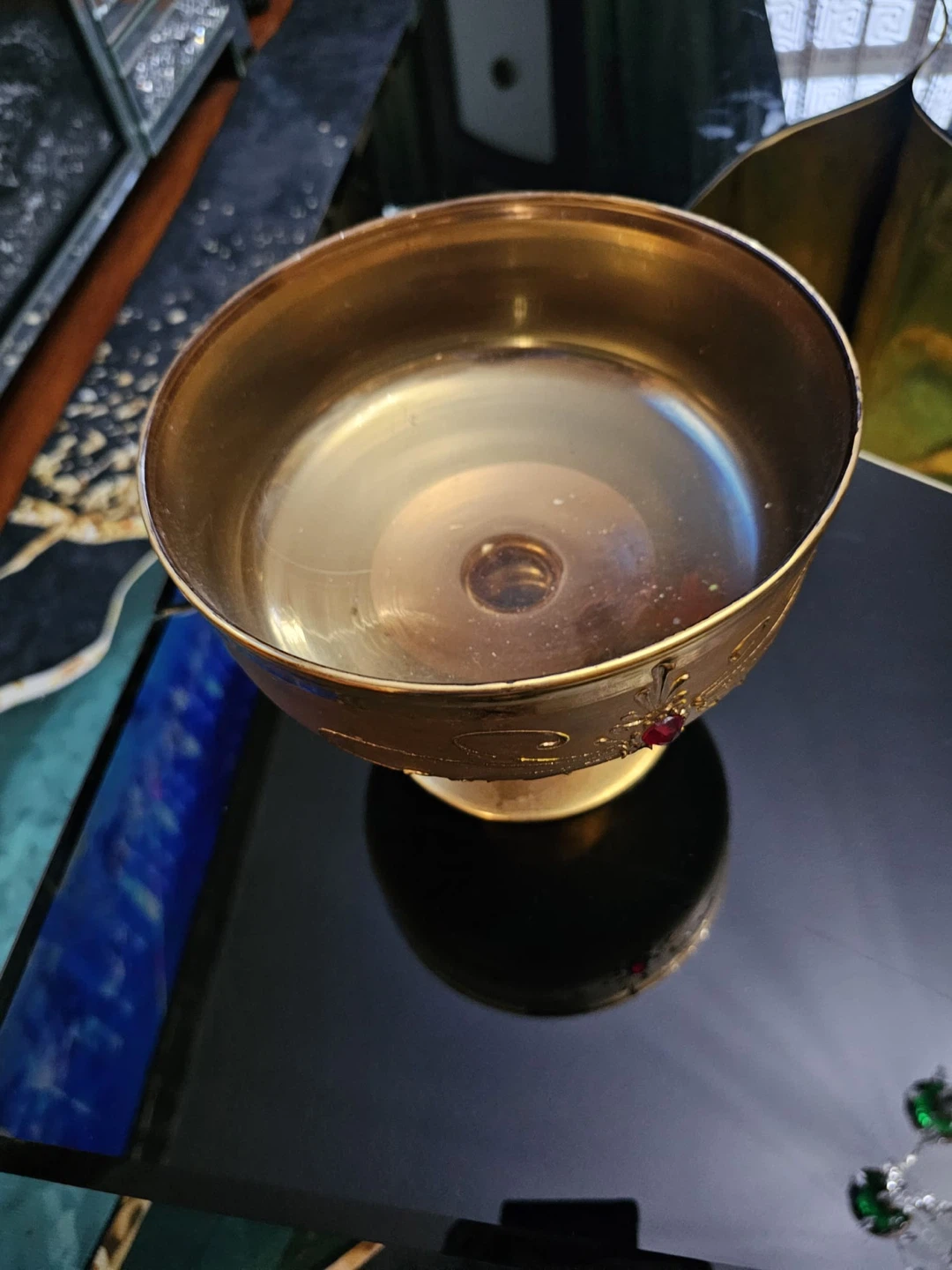 This is a beautiful gold-toned pedestal bowl, perfect for serving or display. It features elegant scrollwork and a vibrant red jewel accent. Its ornate design makes it a lovely centrepiece!