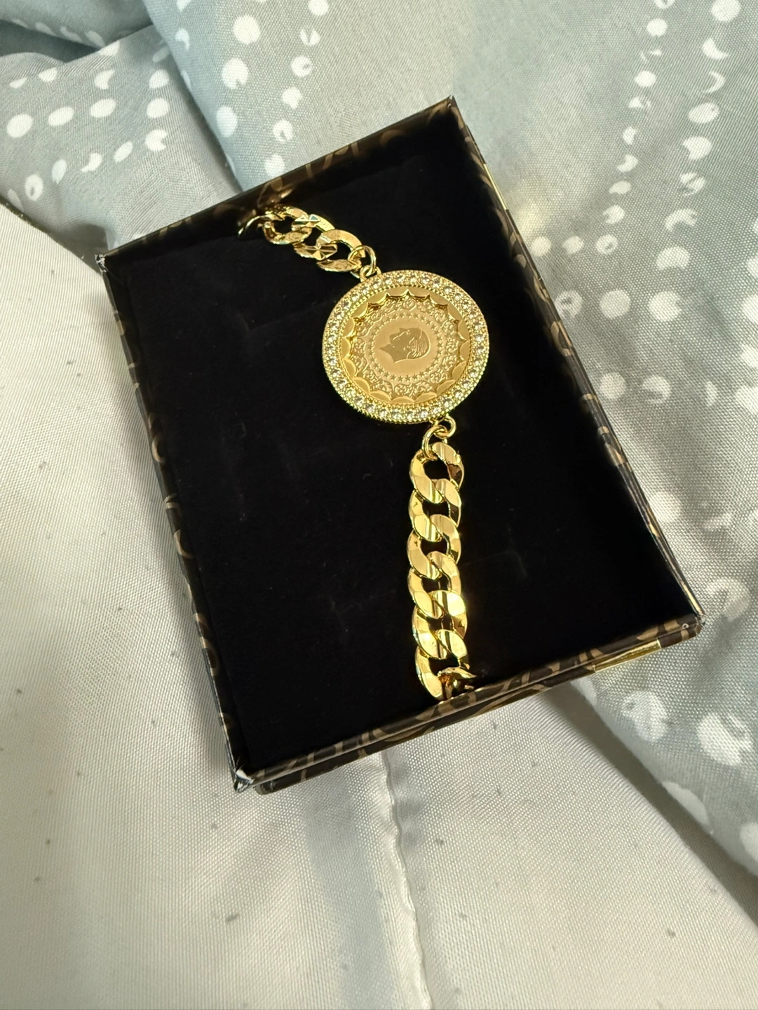 Gold-tone bracelet. Features a large coin charm encrusted with clear stones. Cuban link chain. Comes in a gift box. From Turkey. New. Not a real gold.