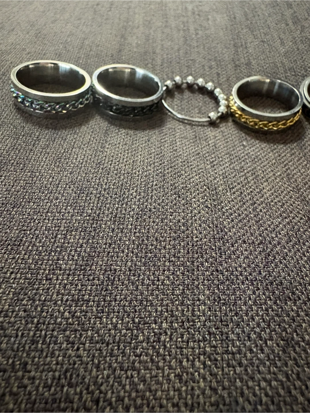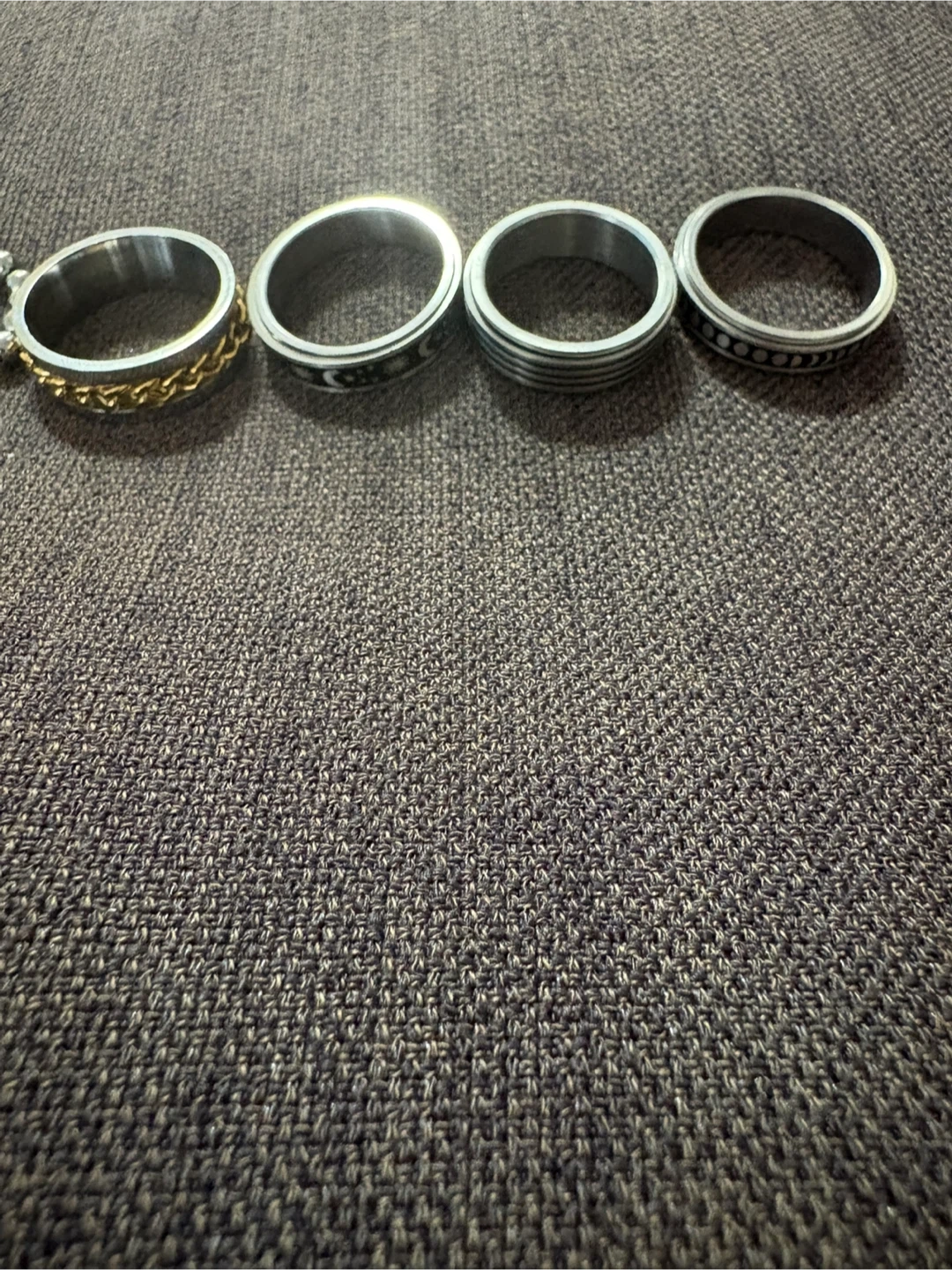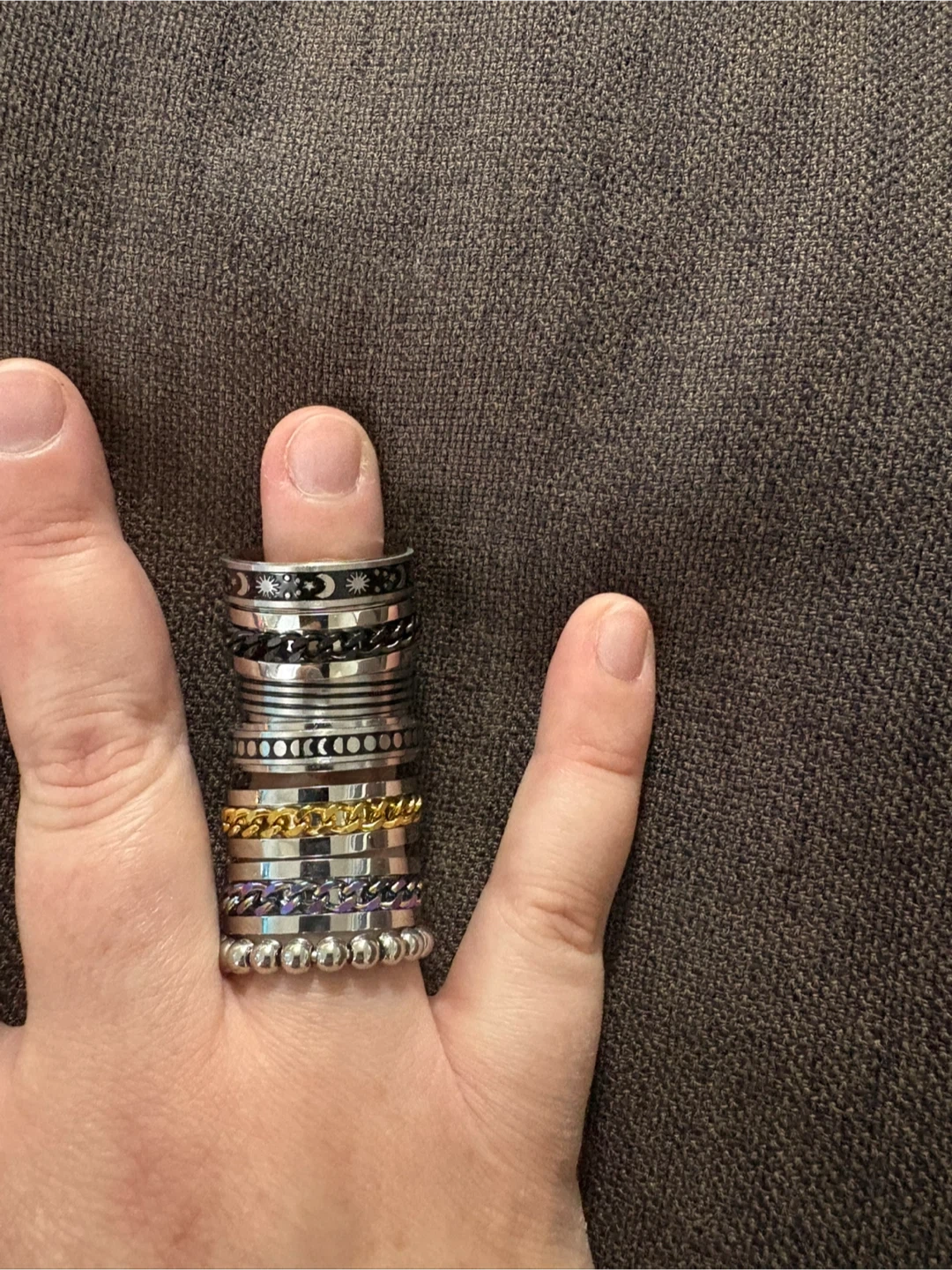 This is a set of 7 spinner rings in various designs. Included are chain link, beaded, and celestial patterns. They are made of stainless steel.
