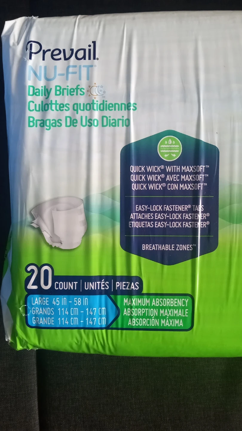 Selling 4 packs of Prevail NU-FIT Daily Briefs. Size large (45 in - 58 in). The pack contains 20 briefs and features quick wick with maxsoft, easy-lock fastener tabs, breathable zones.