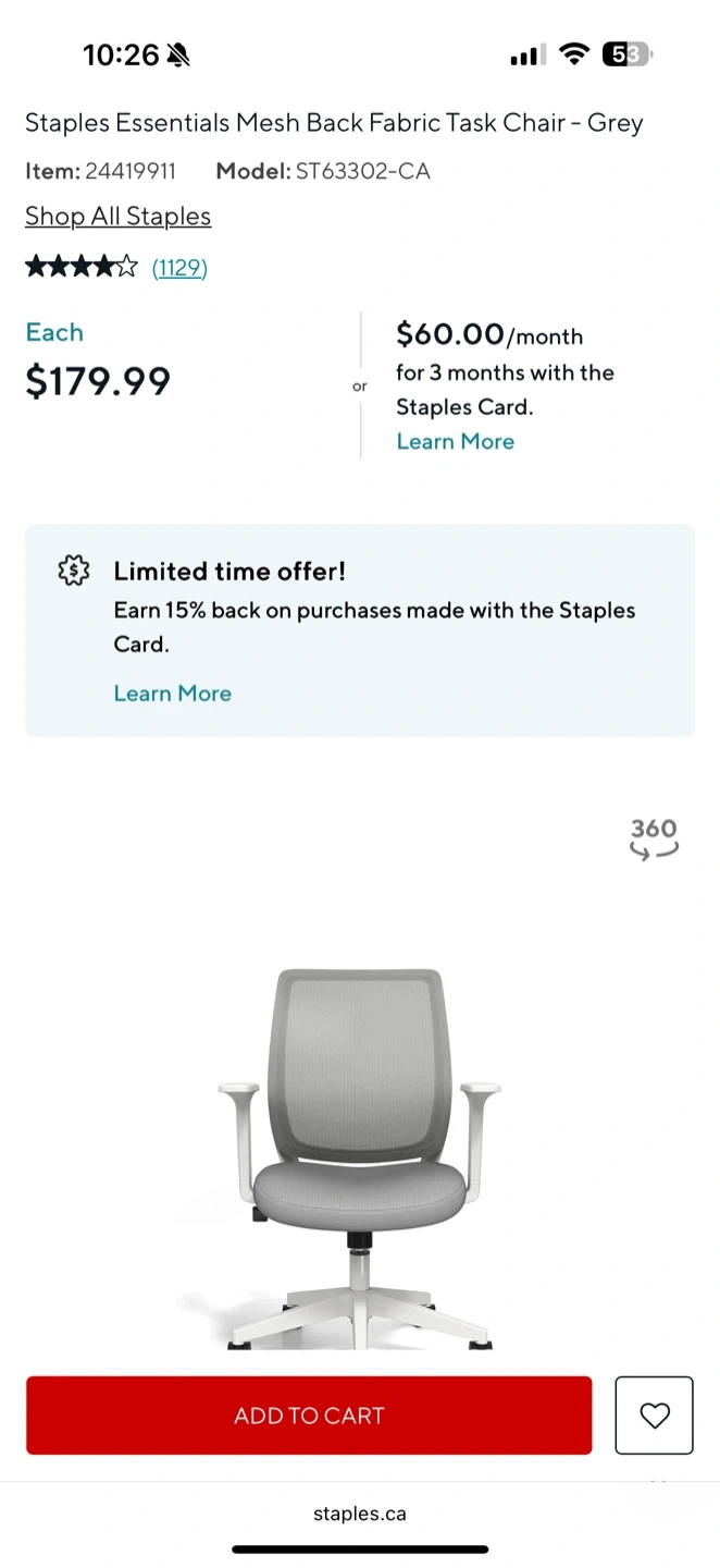 Selling a Staples Essentials Mesh Back Fabric Task Chair in grey. It's in great condition and ready for a new workspace! Model number is ST63302-CA. Originally bought for $179.99