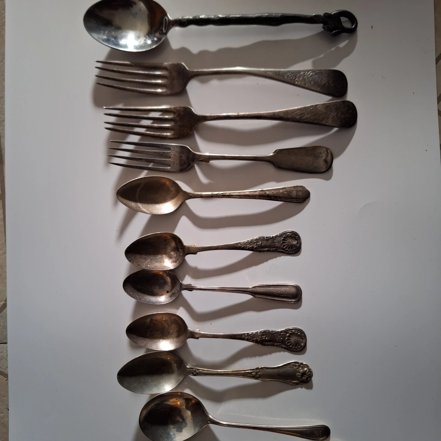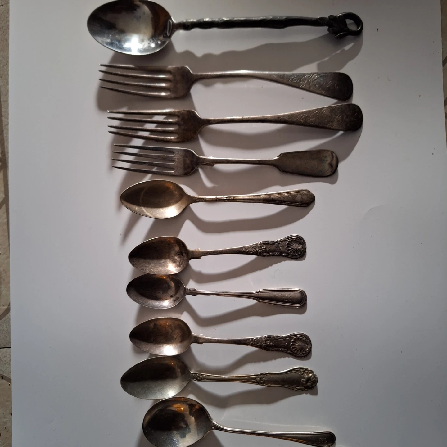 A collection of vintage silver-plated cutlery, including multiple spoons and forks. Each piece has an ornate design on the handle. Some show minor signs of wear consistent with age.