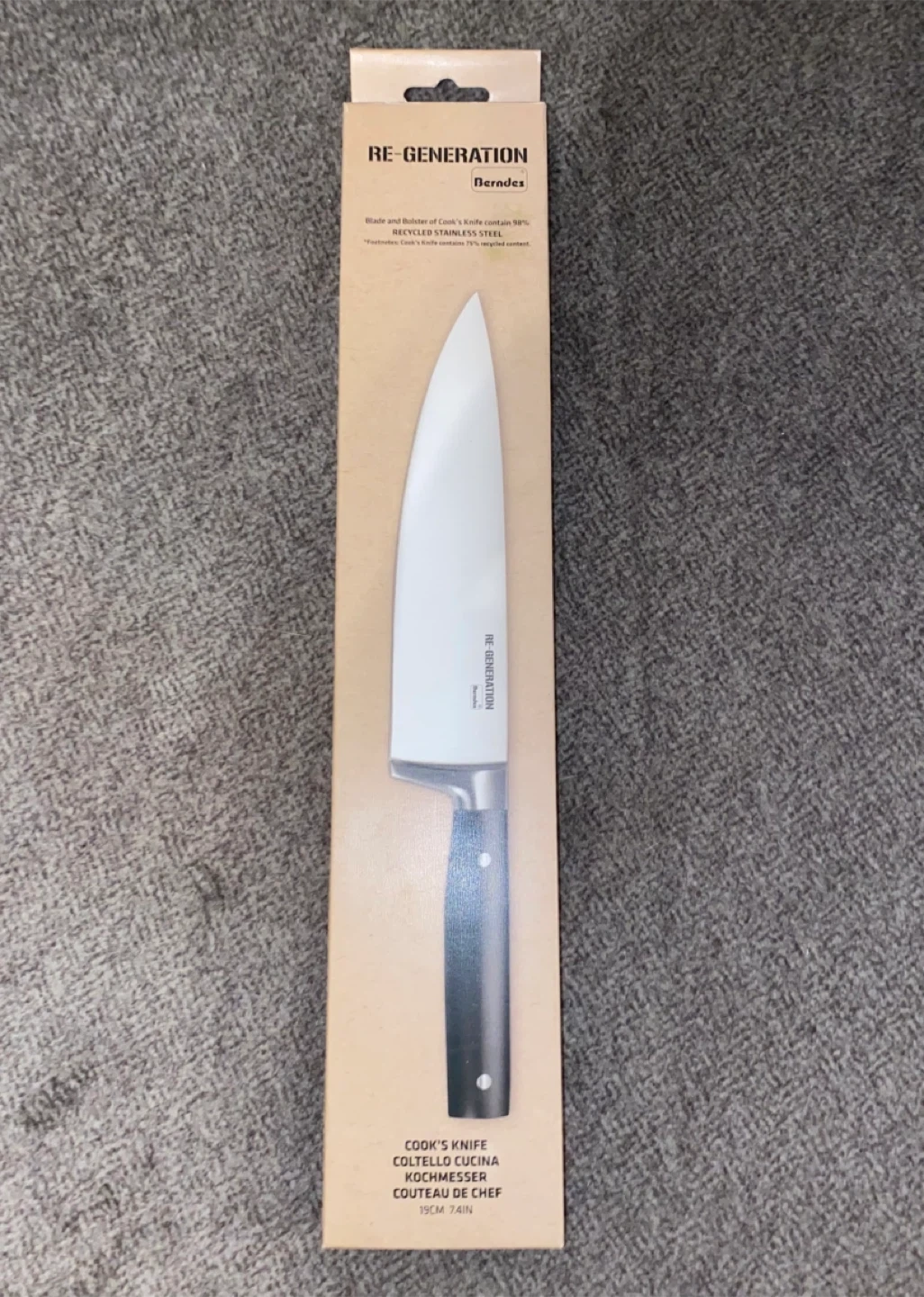 This is a Berndes Re-Generation chef's knife, 19cm or 7.49 inches. It's made from 90% recycled stainless steel. A quality knife for your kitchen prep needs!