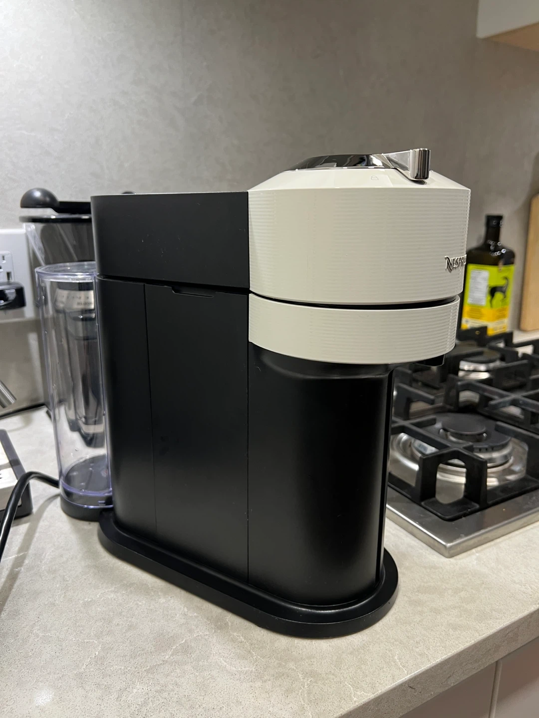 This Nespresso Vertuo coffee machine brews delicious coffee. It's a two-tone design in white and black. Includes a water reservoir and drip tray.