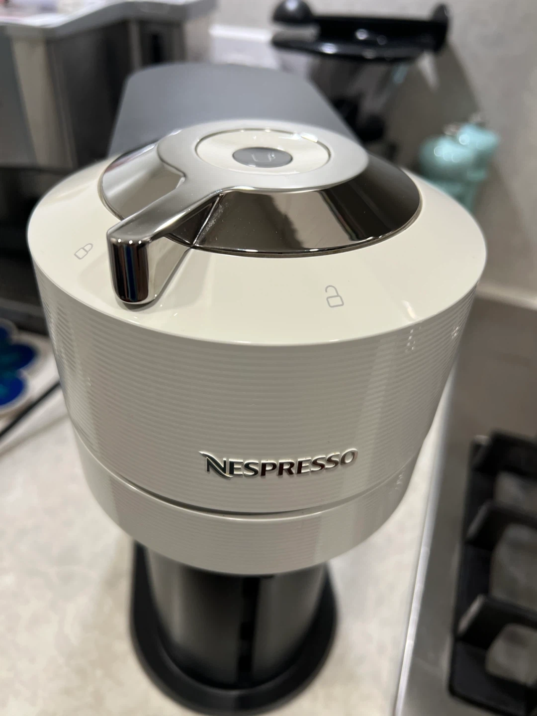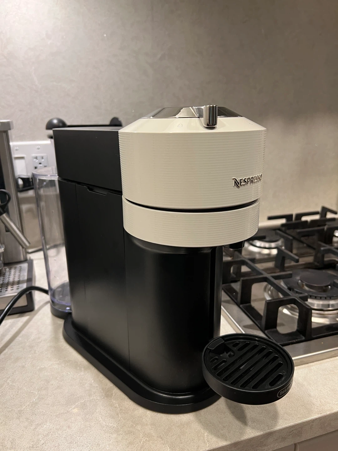 This Nespresso Vertuo coffee machine brews delicious coffee. It's a two-tone design in white and black. Includes a water reservoir and drip tray.