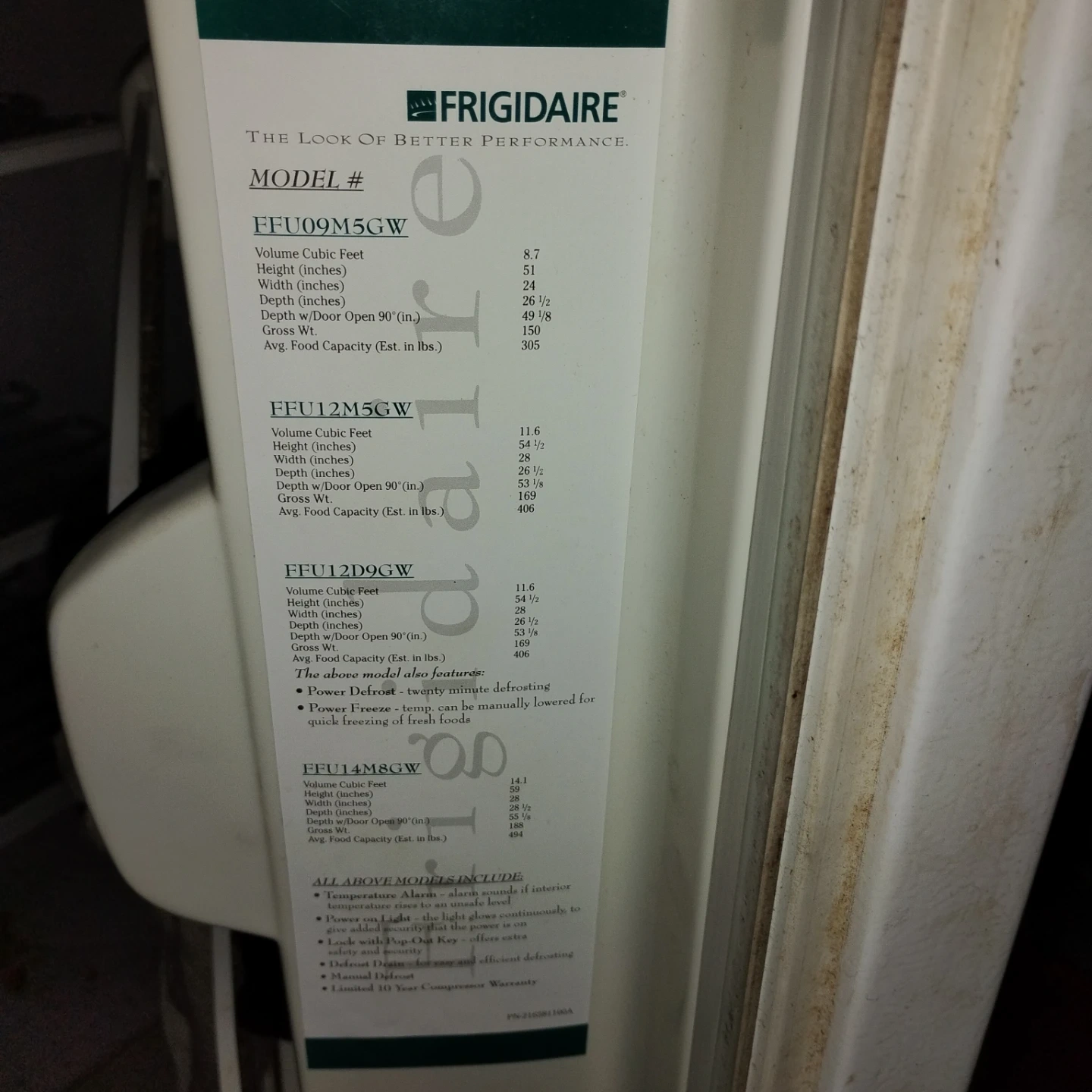 This is a Frigidaire upright freezer. It features a temperature alarm and a power on light. It also has a "Frost-Free" feature for convenience. The freezer uses manual low-frost defrosting.