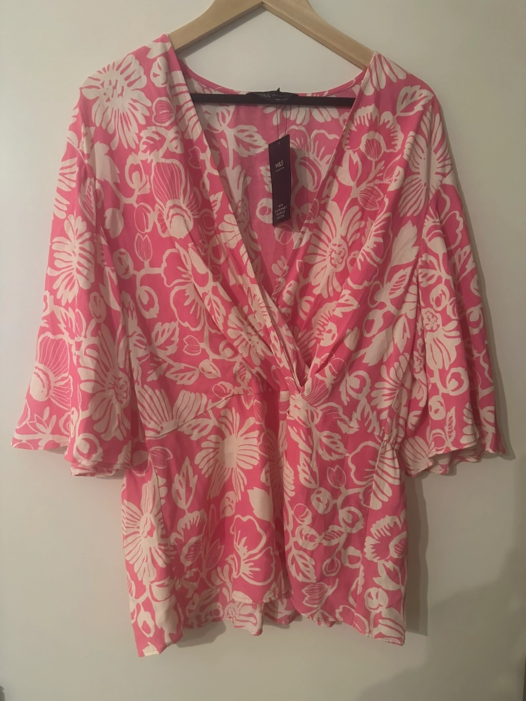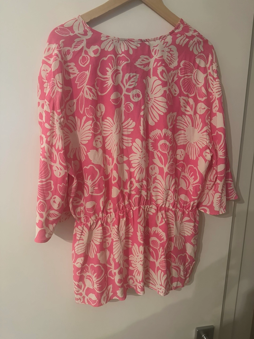 Pink and white floral top with 3/4 sleeves. Elasticated waist. Size xxl states 18 this is uk