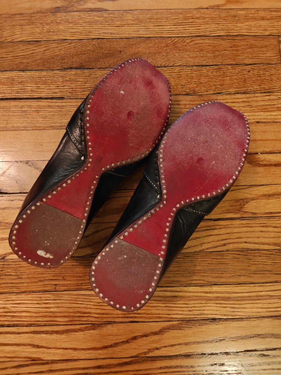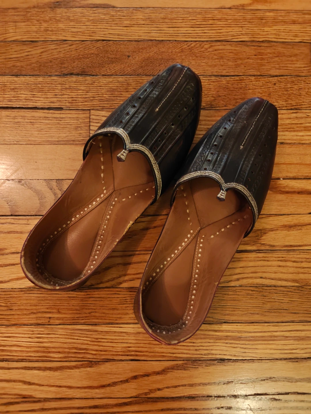 Classic black leather Punjabi jutti shoes with intricate stitching. These traditional slip-on shoes are made from genuine leather for durability.. Perfect for cultural events or everyday wear!