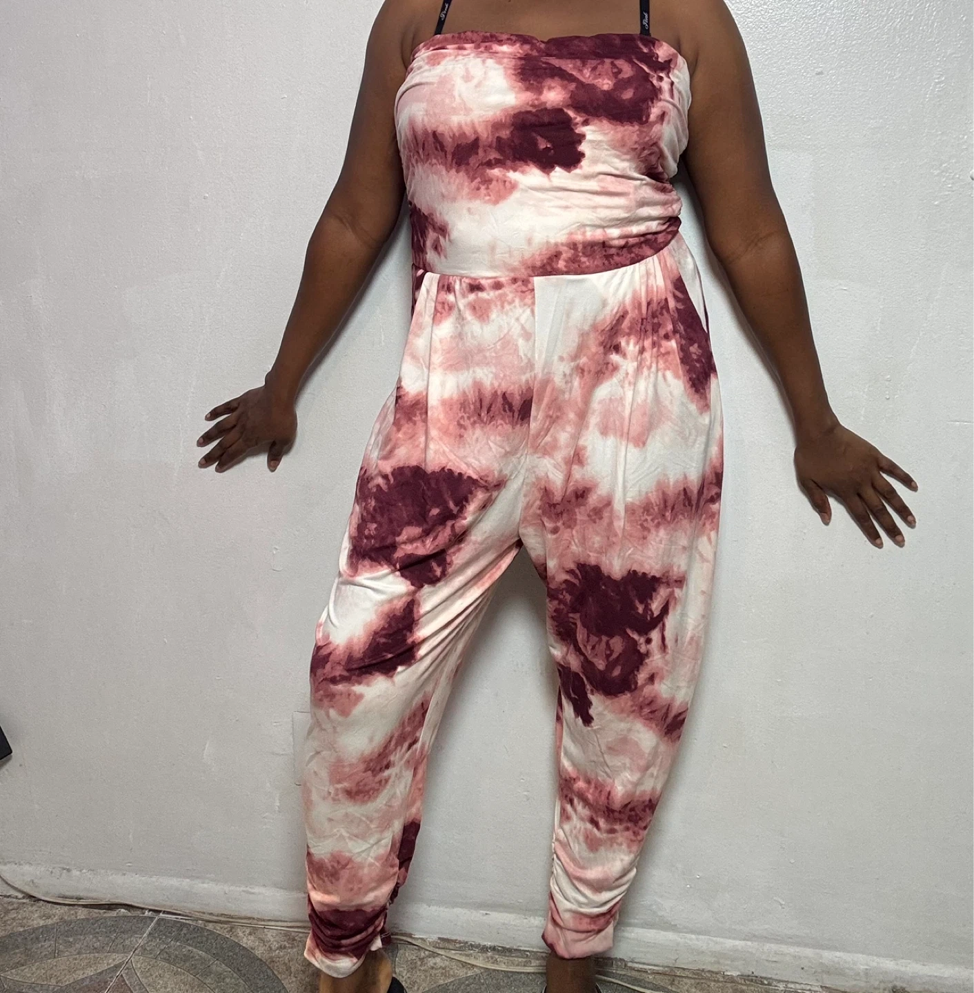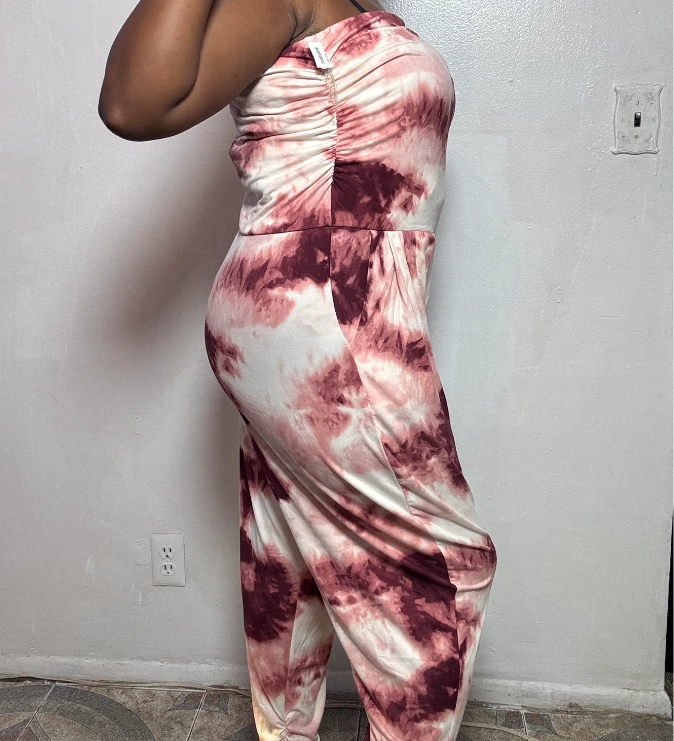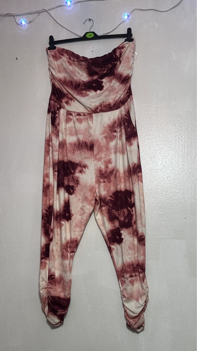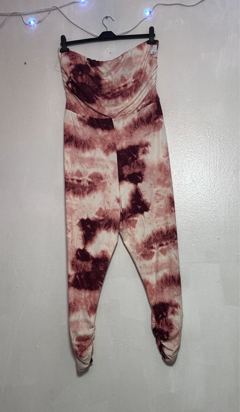 Comfy strapless jumpsuit with a tie-dye pattern. It has a ruched waist and cuffed ankles. Includes pockets on the sides.