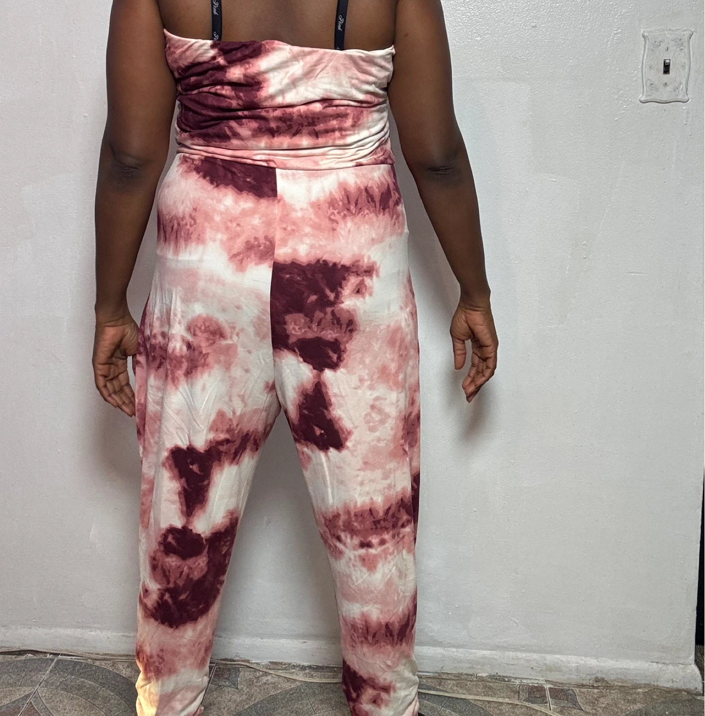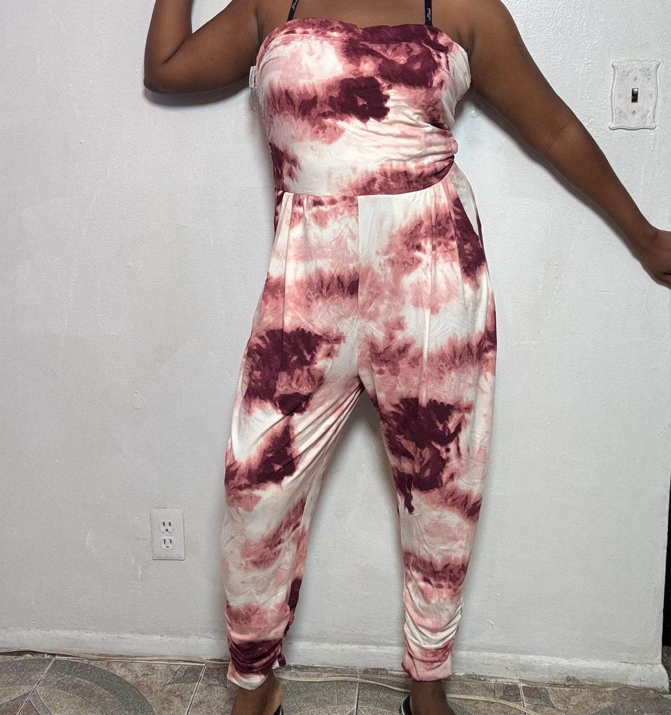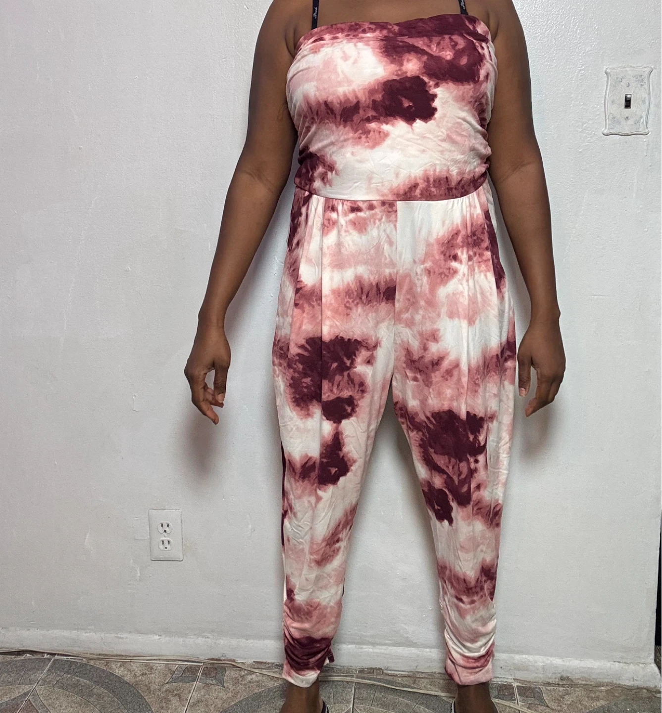 Comfy strapless jumpsuit with a tie-dye pattern. It has a ruched waist and cuffed ankles. Includes pockets on the sides.