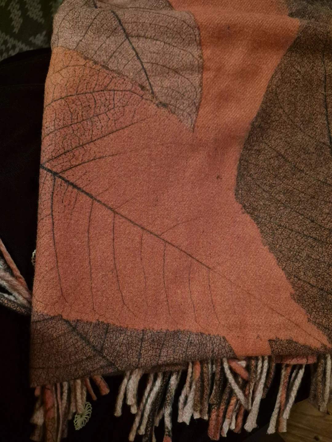I'm selling two scarves. One is a grey knitted scarf with colourful flecks. The other is a leaf-patterned scarf in shades of orange and brown. Both are in good condition and ready to keep you cozy! Each $10